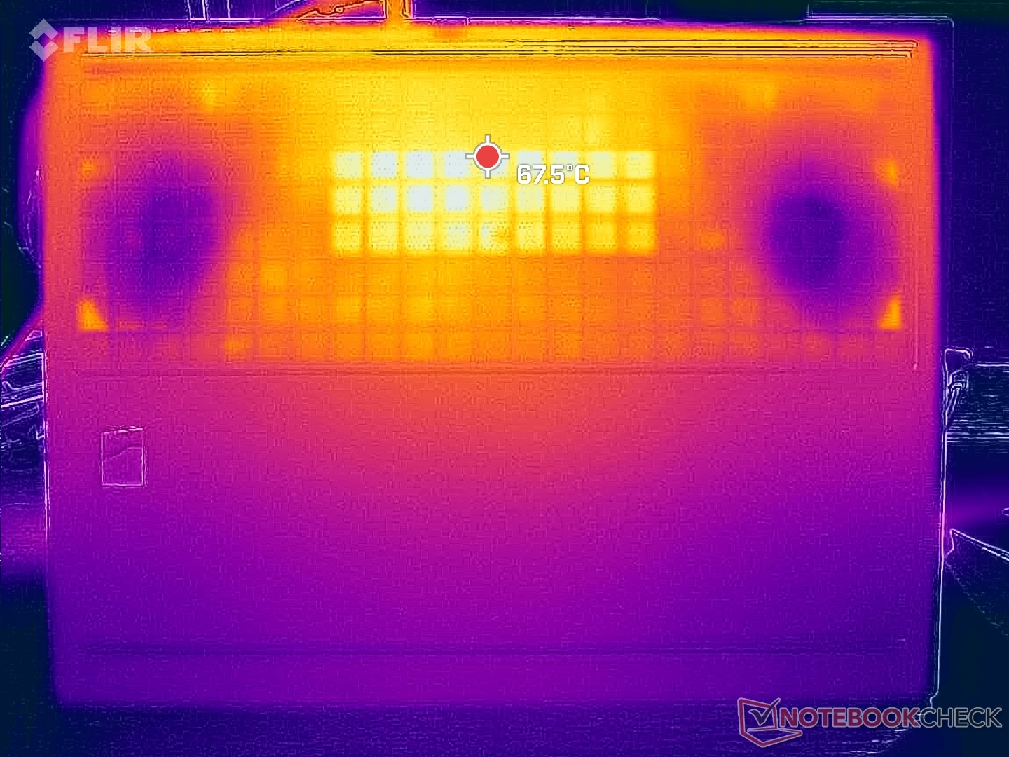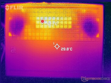 Yttemperaturerna är varmast mot mitten på grund av den symmetriska kylningslösningen inuti. Tangentbordets mitt kan nå 40 till 45 C när du spelar och undersidan kan vara ännu varmare. Detta intervall är dock fortfarande jämförbart medLegion Slim 7i 16 G8. Resten av den bärbara datorn är svalare, inklusive handledsstöden, WASD-tangenterna och piltangenterna där huden oftare kommer i kontakt när du spelar.