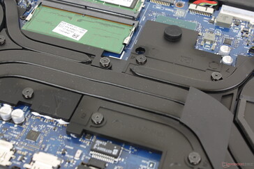 Den nedre panelen är säkrad med bara sex Phillips-skruvar för enkel åtkomst. En anmärkningsvärd förändring från Omen 16 är dock borttagningen av den andra M.2 SSD-kortplatsen på grund av den omplacerade M.2 WLAN-kortplatsen, vilket framgår av jämförelsebilderna nedan. Således kan Omen Transcend 16 endast stödja upp till en intern SSD istället för två. Andra mindre justeringar har också gjorts på högtalarna och kyllösningen.