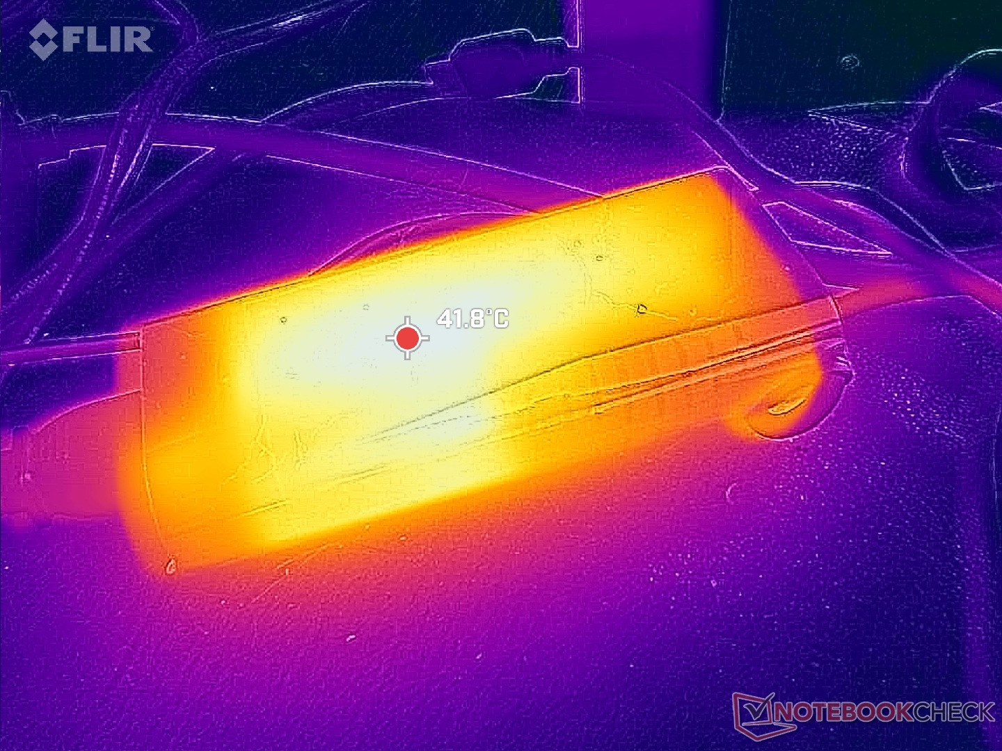 Yttemperaturerna är återigen mycket varmare på den högra halvan av datorn än på den vänstra halvan, vilket framgår av temperaturkartorna nedan på grund av hur kyllösningen är utformad. Hot spots är förutsägbart varmare på vår dGPU-version än iGPU-versionen; toppen och botten när de körs Witcher 3 skulle nå upp till 40 C respektive 46 C, jämfört med bara 35 C och 40 C på iGPU-versionen.