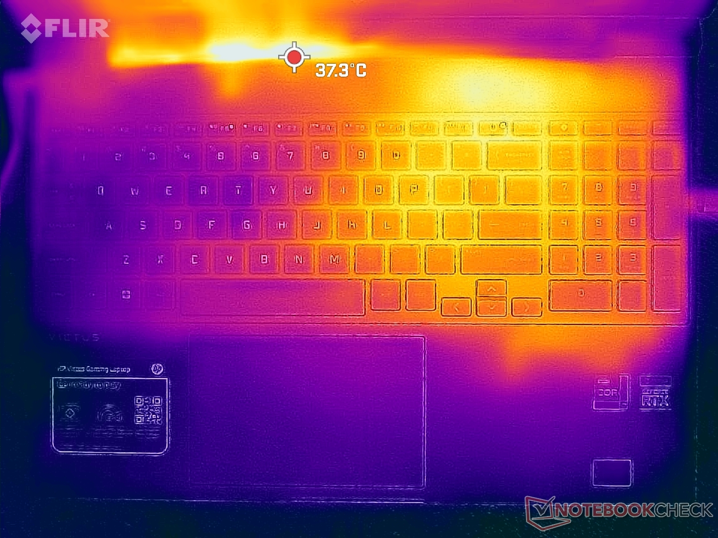 Kylningslösningen är inte symmetrisk till skillnad från de flesta bärbara datorer för spel. Därför kommer den ena halvan av Victus 15-chassit alltid att vara varmare än den andra halvan, vilket våra temperaturkartor nedan visar. Hot spots är tack och lov inte så illa med drygt 38 C på ovansidan eller 36 C på undersidan jämfört med nästan 50 C på den Dell G5 15 utrustad med samma Nvidia GPU. Handflatorna och den vänstra halvan av tangentbordet förblir relativt svala oavsett belastning på skärmen.