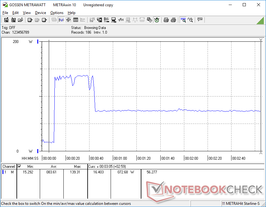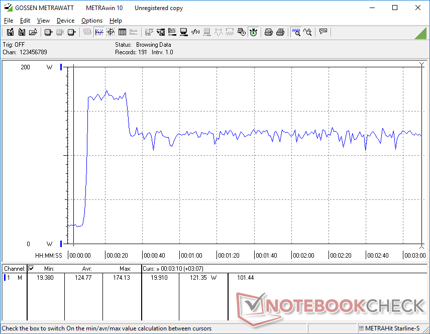 Vi kan mäta ett maximalt uttag på 175 W från den medelstora (~16,5 x 7,8 x 2,5 cm) 200 W AC-adaptern när den är maximalt utnyttjad, vilket framgår av skärmdumpen nedan. Denna hastighet är tillfällig eftersom kylningslösningen inte kan kyla CPU:n tillräckligt för obegränsad Turbo Boost-användning.