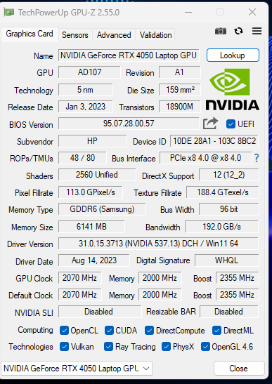 | HP Victus 16-r0076TX Intel Core i5-13500HX, NVIDIA GeForce RTX 4050 Laptop GPU | Acer Nitro 16 AN16-41-R7YE AMD Ryzen 5 7535HS, NVIDIA GeForce RTX 4050 Laptop GPU | Acer Predator Triton 14 PT14-51 Intel Core i7-13700H, NVIDIA GeForce RTX 4050 Laptop GPU | Alienware m16 R1 Intel Intel Core i7-13700HX, NVIDIA GeForce RTX 4060 Laptop GPU | Acer Predator Helios 16 PH16-71-731Q Intel Core i7-13700HX, NVIDIA GeForce RTX 4060 Laptop GPU | Dell G15 5530 Intel Core i7-13650HX, NVIDIA GeForce RTX 4060 Laptop GPU | Lenovo Legion Pro 5 16ARX8 (R5 7645HX, RTX 4050) AMD Ryzen 5 7645HX, NVIDIA GeForce RTX 4050 Laptop GPU | Lenovo LOQ 15APH8 AMD Ryzen 7 7840HS, NVIDIA GeForce RTX 4050 Laptop GPU | |