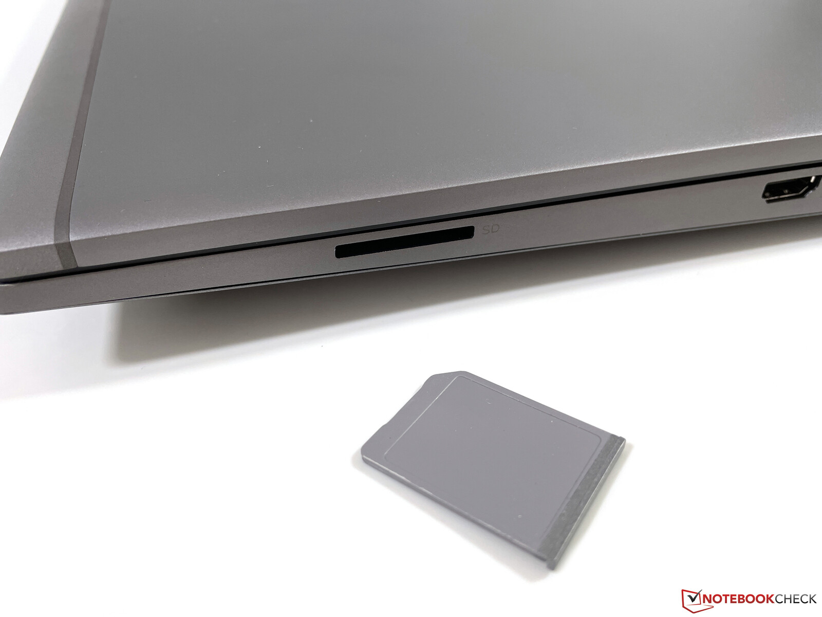 HP använder fortfarande en fullstor SD-kortläsare på höger sida, och SD-kortet är helt insatt. Jämfört med tidigare modellär dock prestandan mycket lägre och vi kan bara få upp till 90 MB/s i benchmarks, medan ZBook Fury 17 G7 fortfarande klarade 170 MB/s. Förutom vårt nuvarande referenskort (Angelbird AV Pro V60) kontrollerade vi även vårt tidigare kort från Toshiba för att utesluta eventuella kompatibilitetsproblem, men resultaten var nästan identiska.