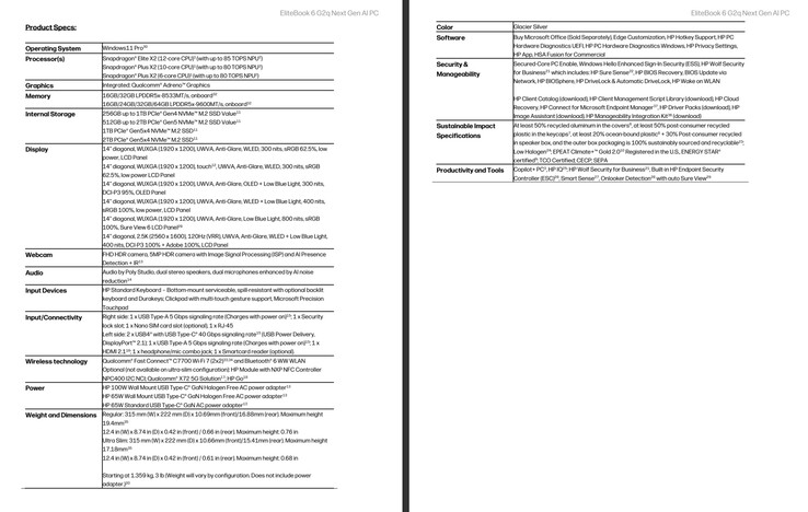 När det gäller EliteBook 6 G2q erbjuder HP den också med antingen upp till 32 GB LPDDR5X-8533 eller 64 GB LPDDR5X-9600 RAM, beroende på vilken processor du väljer. På samma sätt kommer den nya 14-tums bärbara datorn att kunna konfigureras med upp till 1 TB PCIe Gen 4 och 2 TB PCIe Gen 5 lagring. Bluetooth 6- och Wi-Fi 7-anslutningar hanteras av Qualcomms Fast Connect C7700-modem. Ett X72 5G-modem finns också till hands, liksom en NXP NPC400 NFC-kontroller.