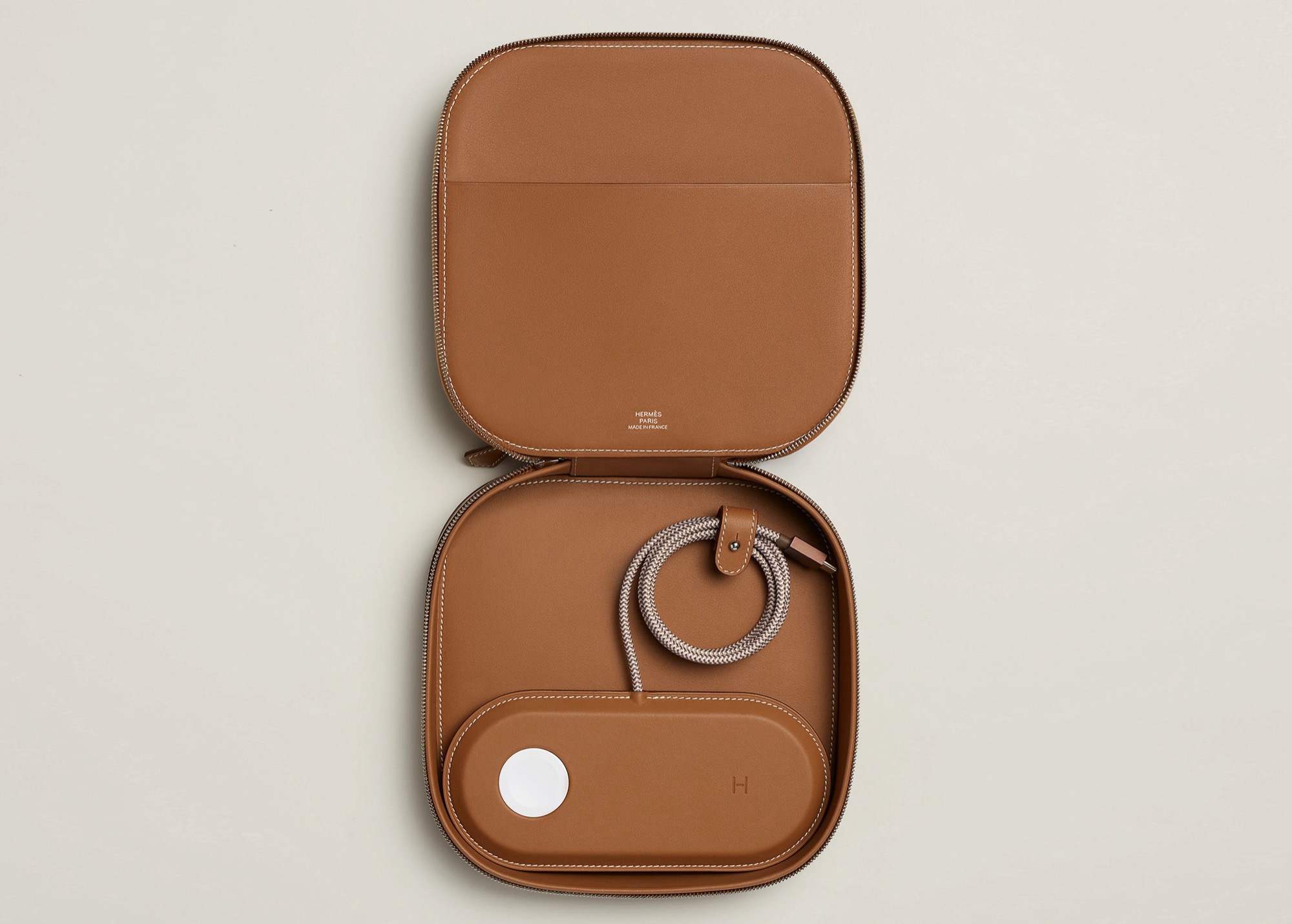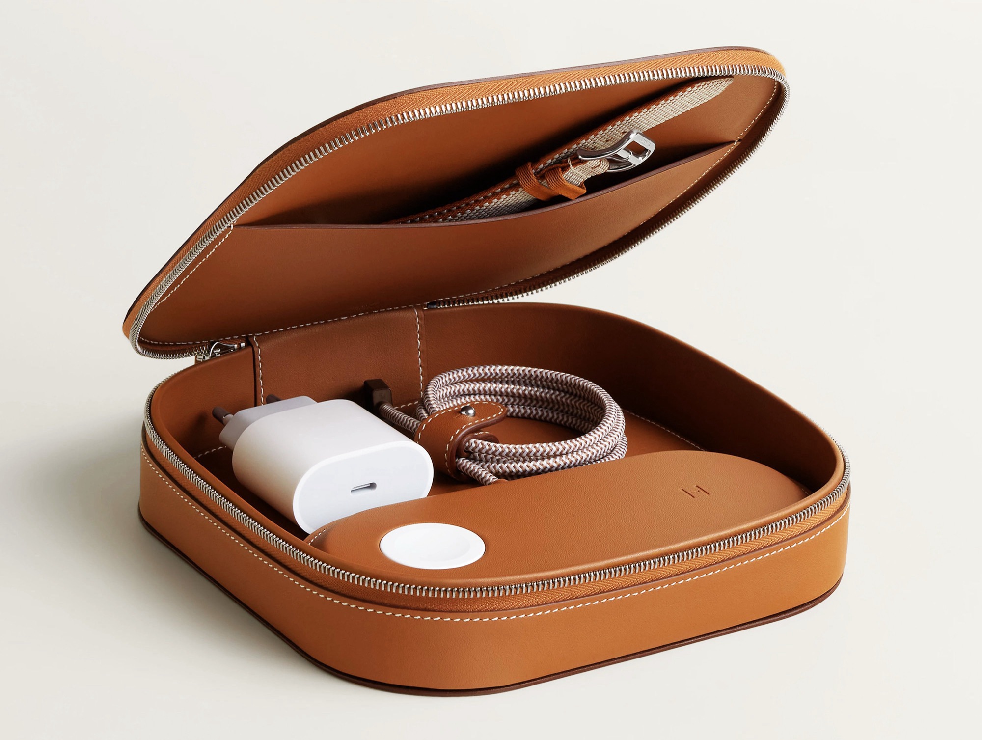 Hermès Paddock Duo MagSafe-laddaren och Grand Paddock-fodralet finns nu tillgängliga för 5 150 $ från officiella onlinebutik. Enbart laddaren kostar 1 750 dollar, och Hermès erbjuder också ett paket med ett mindre ovalt fodral för 4 225 dollar