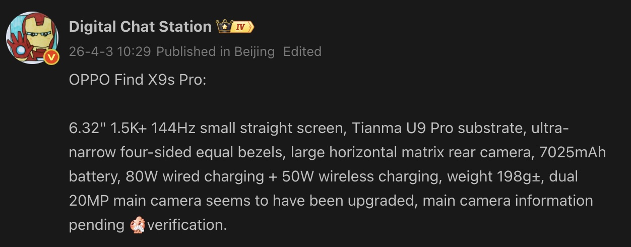 Oppo har officiellt bekräftat att Find X9s Pro kommer att lanseras den 21 april i Kina. Hittills har företaget avslöjat att flaggskeppstelefonen kommer att ha dubbla 200MP-sensorer och Hasselblad-tuning. Nu har en framstående tipsare delat ytterligare information om enheten.