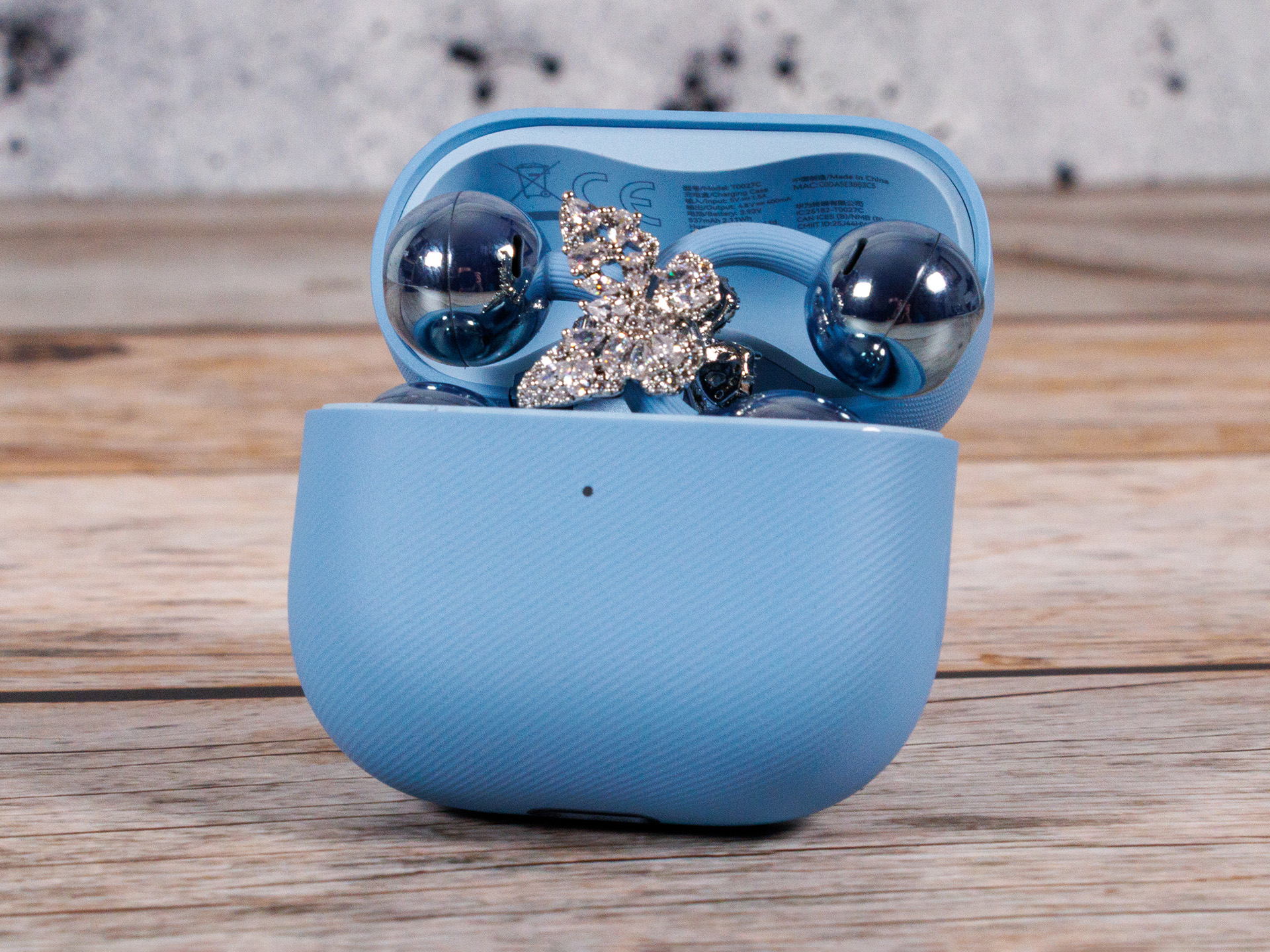 Alternativt finns smycken från andra leverantörer också tillgängliga. För teständamål fick vi en uppsättning glittrande fjärilar som fäster perfekt på hörlurarna. En nackdel är att de måste tas bort varje gång FreeClip 2 sätts tillbaka i fodralet, eftersom locket annars inte kan stängas. Detta är dock inget problem om bara en öronsnäcka sitter i fodralet.