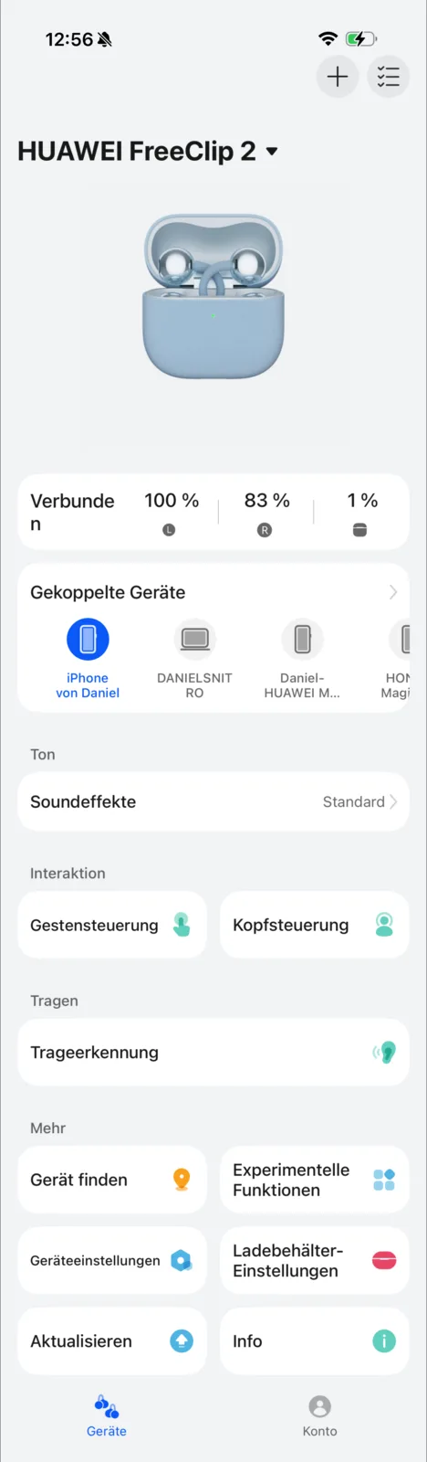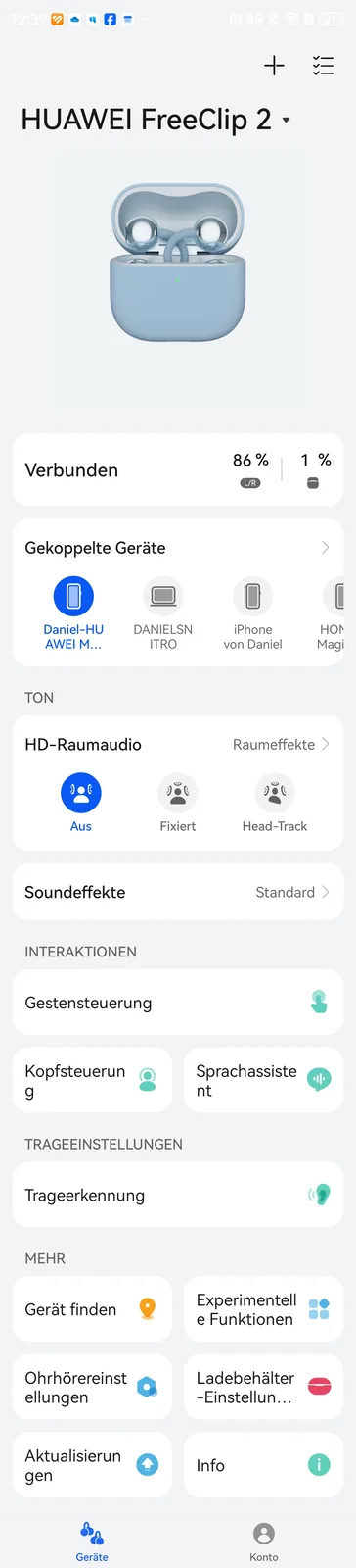 Det är enkelt att installera Huawei FreeClip 2 via Bluetooth-parning. Tack vare Microsoft Swift Pair sker detta automatiskt på datorer så snart laddningsfodralet öppnas för första gången. Detsamma gäller för Huaweis smartphones och surfplattor. Eftersom Google Fast Pair inte stöds måste parkopplingsprocessen initieras manuellt. Multipoint-stöd gör att två enheter kan parkopplas samtidigt, och parkopplingslistan kan hantera upp till åtta enheter.