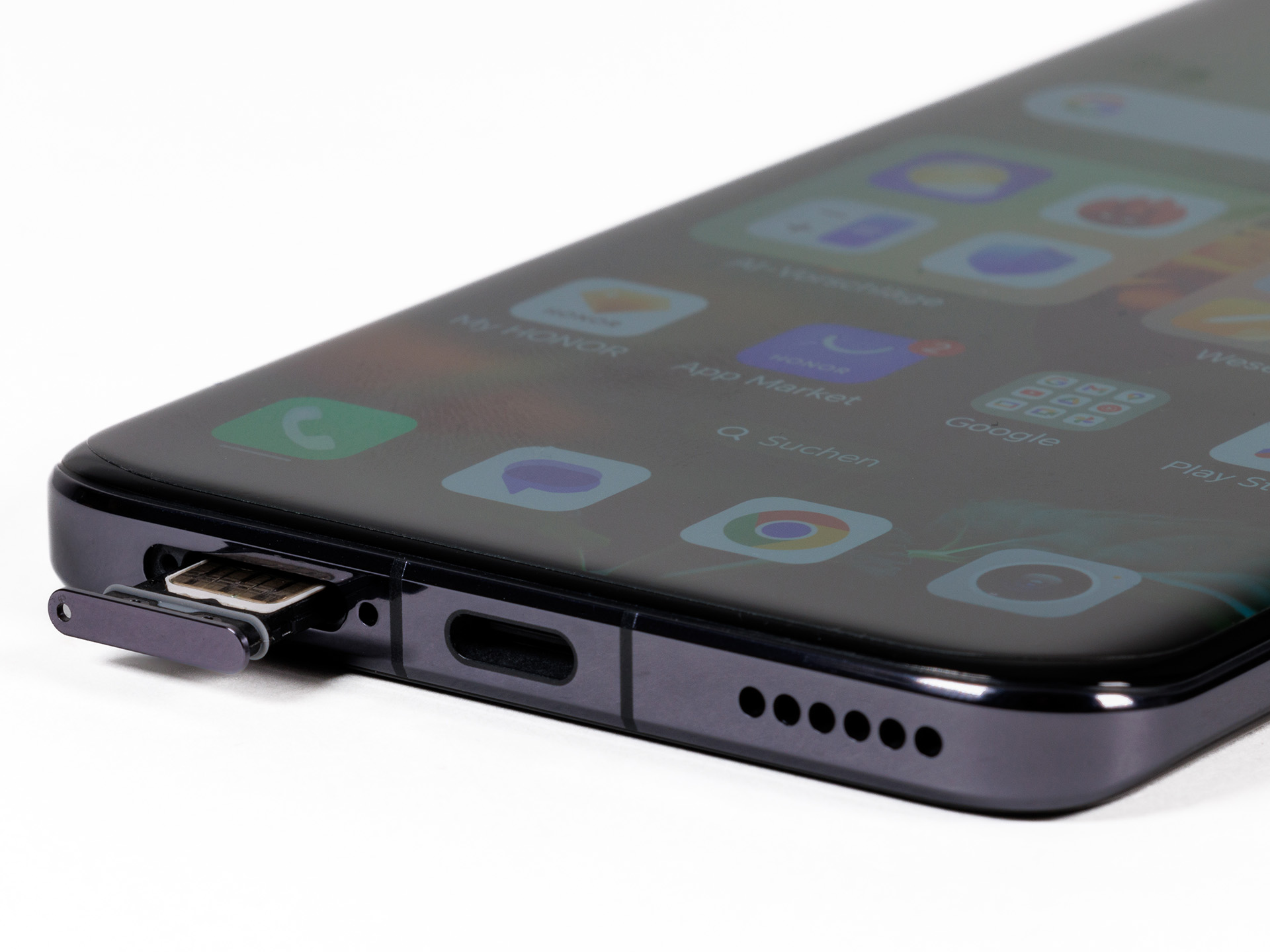 Magic6 Pro har en snabb USB 3.2-port (Gen. 1), som även kan användas för extern kringutrustning och lagringsmedia tack vare USB OTG. De senare kan formateras med FAT, FAT32, exFAT eller NTFS. I kopieringstestet med en extern hårddisk (Samsung 980 Pro i en Asus ROG Strix Arion, USB 3.2 Gen. 2) uppnådde Honor smartphone ett genomsnitt på 249,78 MB/s. Trådbunden bildöverföring är också möjlig på porten, inklusive ett valfritt skrivbordsläge.