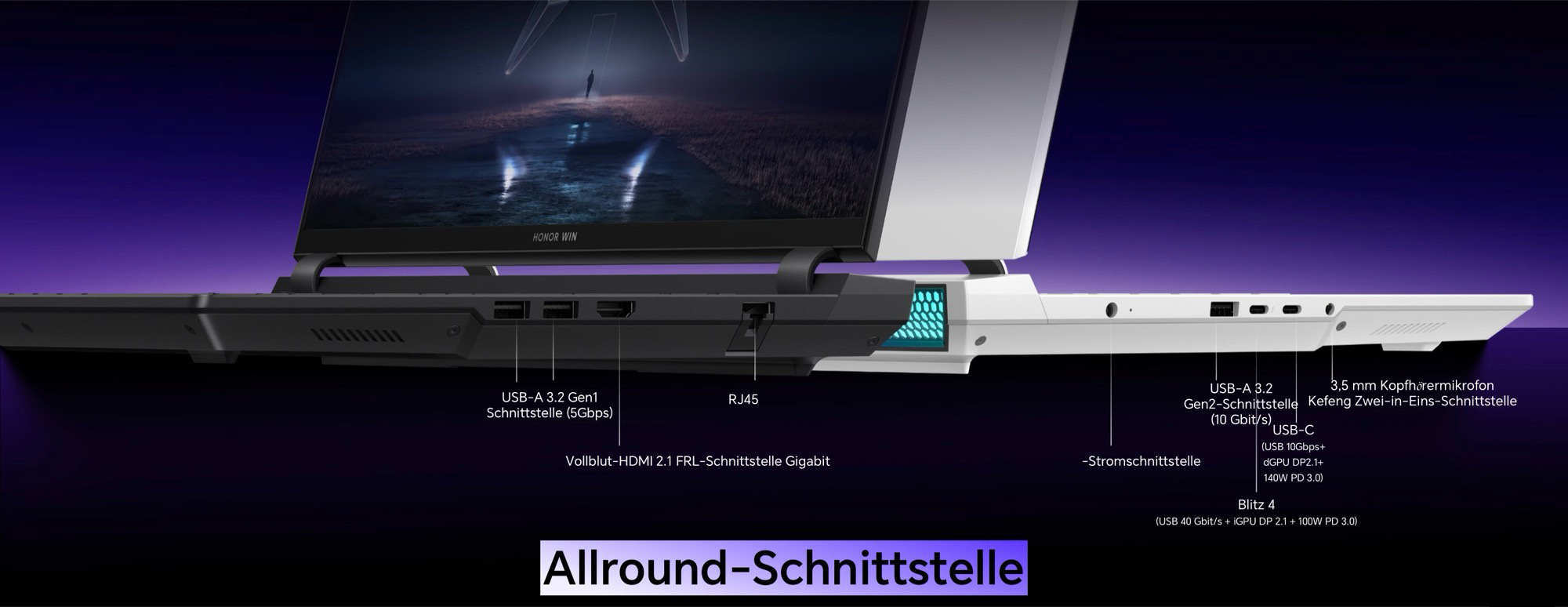 Av detta tilldelas maximalt 140 watt till Nvidia GeForce RTX 5070 Ti GPU för bärbar datorresten förbrukas av Intel Core Ultra 9 290HX Plus. Honor använder en 16-tums IPS-panel i 16:10-format, som erbjuder en upplösning på 2 560 x 1 600 pixlar, en ljusstyrka på 500 nits och en bildfrekvens på 300 Hz; enligt Honor kan DCI-P3-färgrymden visas i sin helhet. Batteriet rymmer 92 Wh. Med Thunderbolt 4 (USB-C), USB-C 3.2 Gen 2, tre USB-A-portar, HDMI 2.1 och Ethernet erbjuder den bärbara datorn ett brett utbud av anslutningar.