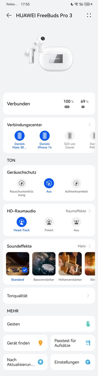 I appen kan du bestämma om du vill ha wear recognition på eller av, installera uppdateringar och anpassa touch-ingångarna så att de passar dina individuella behov. Där kan du också hitta equalizer- och ANC-inställningar. Om du parkopplar flera enheter med FreeBuds Pro 3 kommer du att uppskatta anslutningscentret, som gör att du snabbt kan växla från en parkopplad enhet till en annan eller hantera dina enheter.