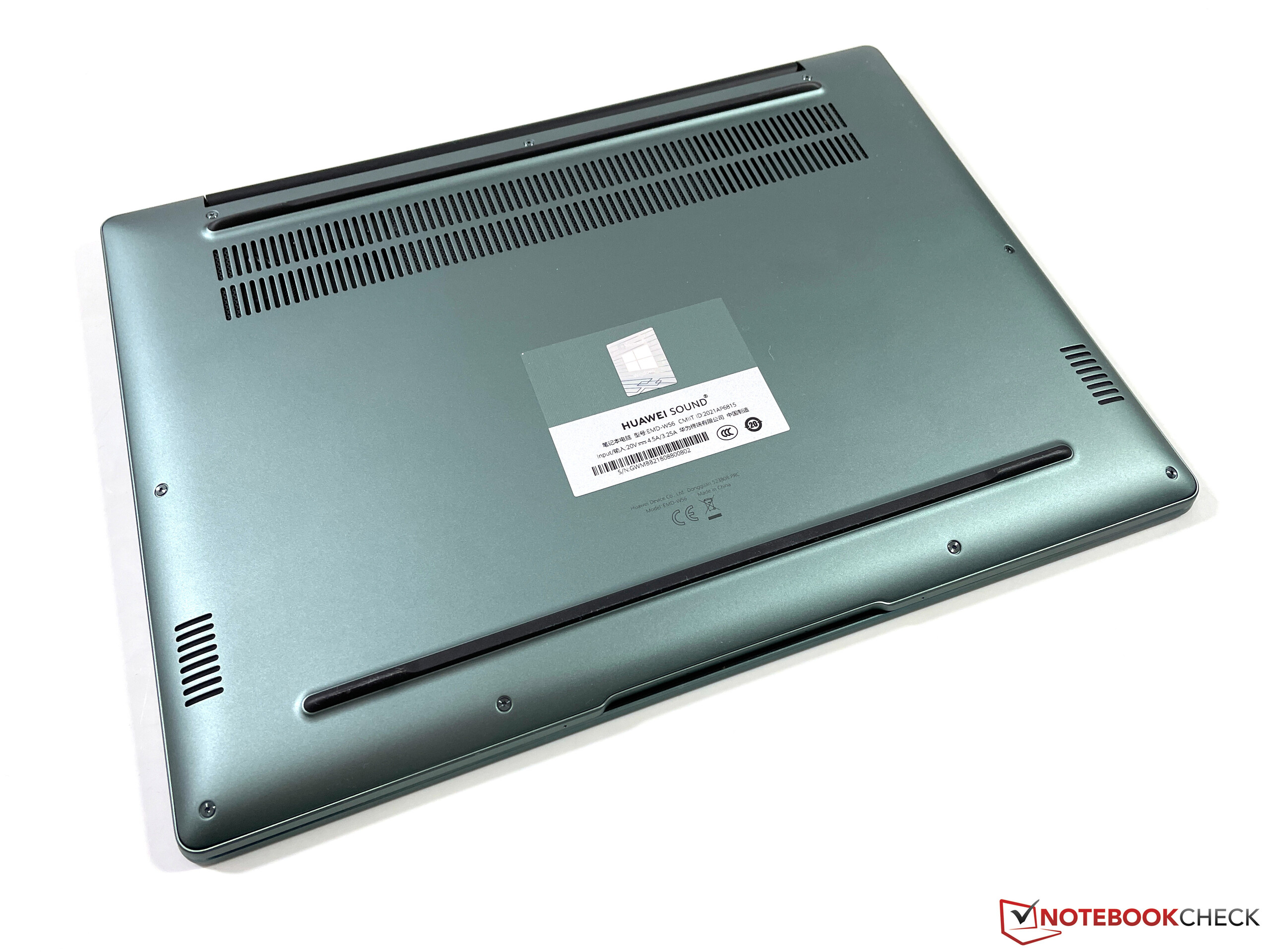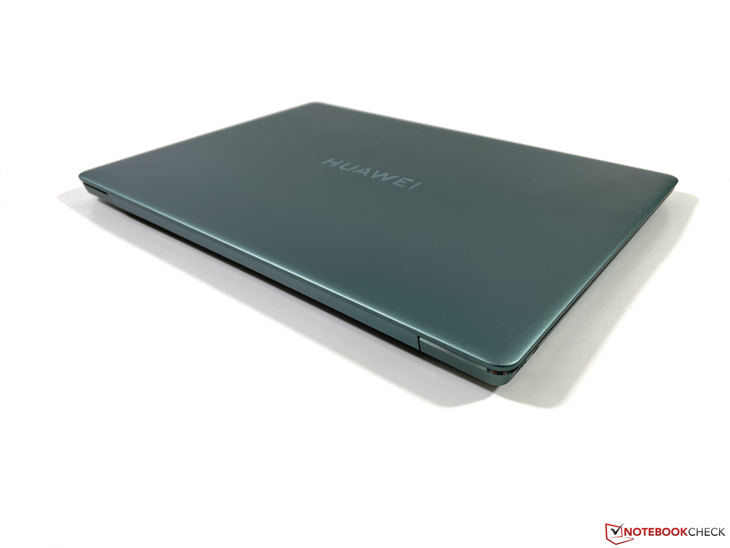 Den kompakta enheten är också övertygande när det gäller stabilitet; tangentbordsdäcket böjer sig bara något vid mycket tryck, vilket också krävs för att framkalla mindre krusningar på skärmen. Detta bör dock inte vara något problem i praktiken. Huawei har anpassat det centrala gångjärnet väl och det håller skärmen på plats upp till den maximala öppningsvinkeln på cirka 150 grader. Tack vare den lilla fördjupningen på basenhetens framsida är det mycket lätt att öppna locket. Strömknappen med fingeravtrycksläsare (som fungerar bra) är placerad på höger sida ovanför tangentbordet.