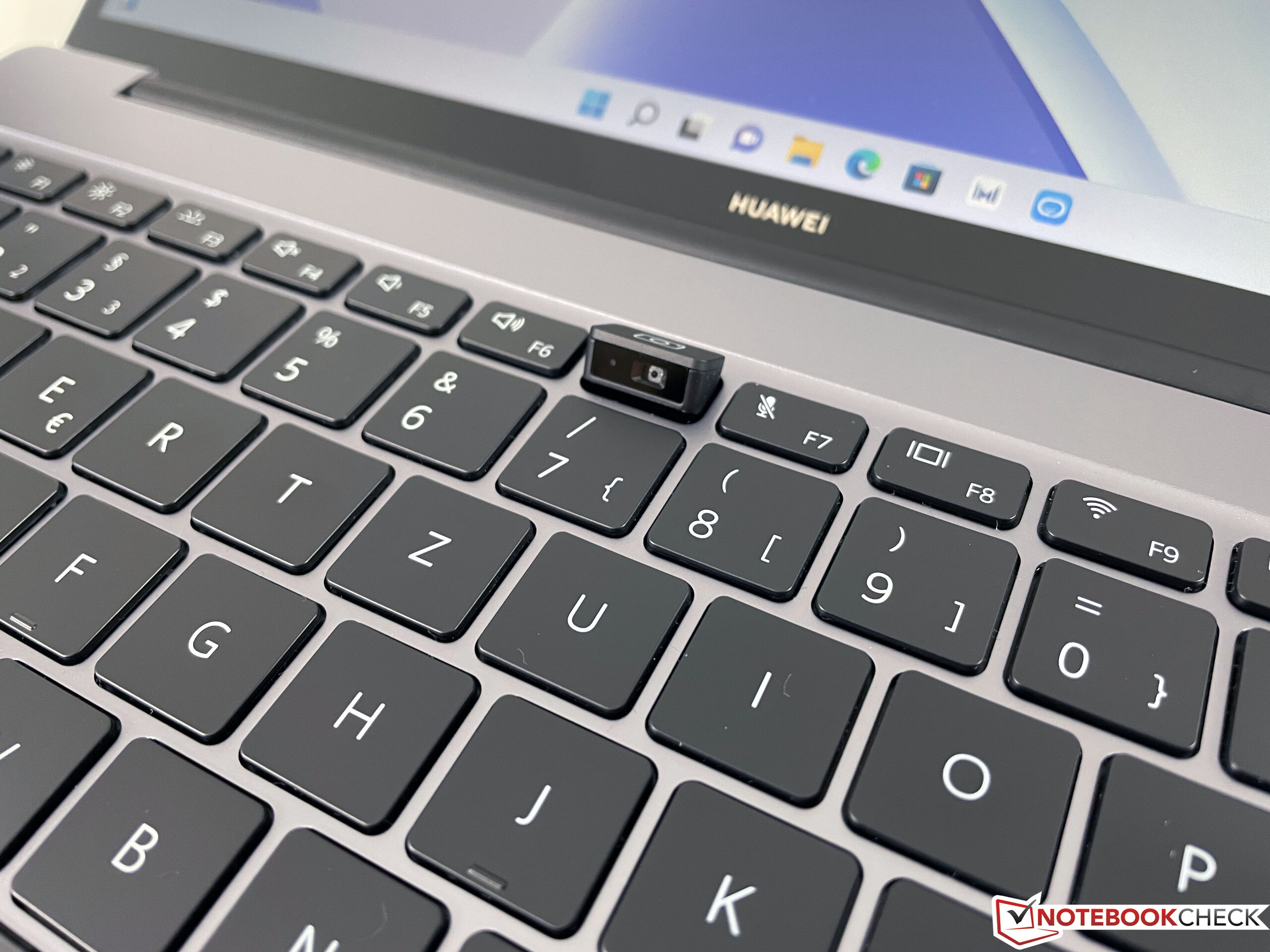 Placeringen av webbkameran, som är gömd inuti tangentbordet, visar tydligt att det är en "gammal" design, medan nyare modeller som MateBook 14s har webbkameran ovanför skärmen. Kvaliteten på 1 MP-enheten är inte särskilt bra och det finns synliga förvrängningar på grund av placeringen. Vinkeln underifrån är inte heller särskilt gynnsam vid möten. Lösningen är dock utan tvekan bra när det gäller integritetsfrågor