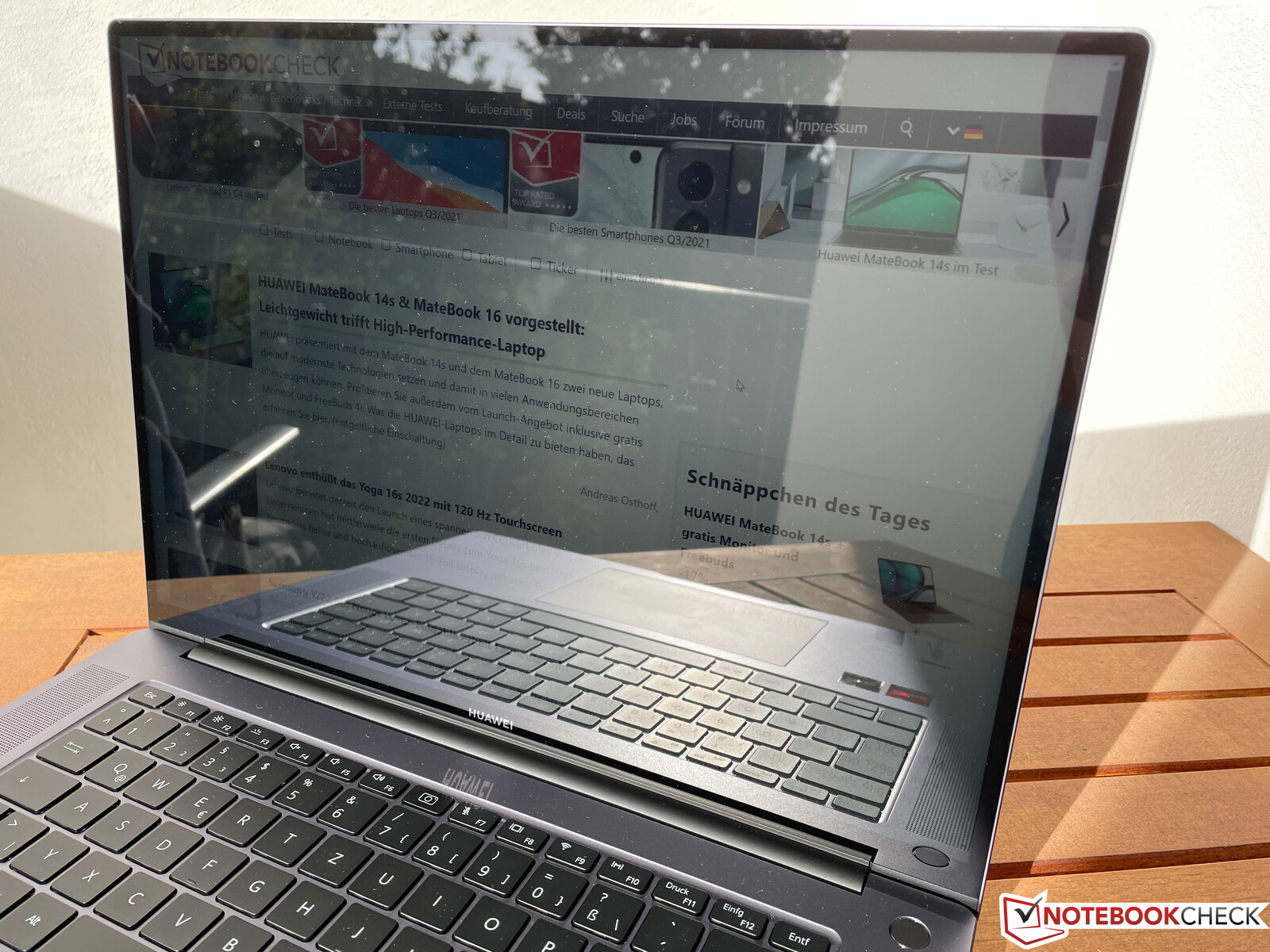 I likhet med andra Huawei-modeller är den nya MateBook 16 utrustad med en panel som har ett 3:2-skärmförhållande. Den 16-tums panelen har 2520 x 1680 pixlar, vilket resulterar i en pixeltäthet på 189 DPI. Den reflekterande skärmen ger ett bra intryck, subjektivt sett. Skärminnehållet visas mycket tydligt och färgerna är starka. Betraktningsvinkelstabiliteten hos BOE IPS-panelen är mycket bra