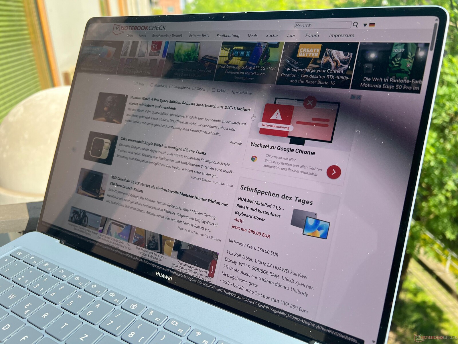 Bortsett från den låga vikten präglas användarupplevelsen främst av den bärbara datorns nya OLED-skärm som erbjuder fantastisk bildkvalitet och mycket högre ljusstyrka jämfört med konkurrenterna från Samsung. En SDR-ljusstyrka på över 600 nits i kombination med den låga reflektionsnivån innebär dessutom att du enkelt kan använda MateBook utomhus. Tack vare den höga uppdateringsfrekvensen bör PWM-flimmer inte vara något problem för de flesta användare. Å andra sidan är de medföljande färgprofilerna sRGB och AdobeRGB inte de mest exakta, vilket innebär att enheten inte är idealisk för bildredigering.
