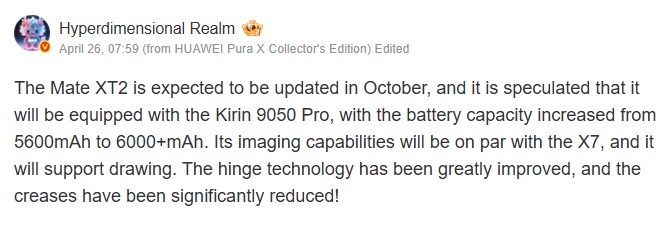 Enligt läckan kommer Mate XT2 att drivas av Kirin 9050 Pro-chipet. Utöver detta, medan detaljer om skärmen fortfarande är begränsade, hävdar tipsaren att Huawei har gjort stora förbättringar av gångjärnstekniken. Detta kommer inte bara att förbättra hållbarheten hos vikmekanismen utan också minska det synliga vecket, vilket är en av de största farhågorna med vikbara telefoner. A tidigare läcka föreslog också att enheten skulle kunna använda avancerat ultraflexibelt glas.