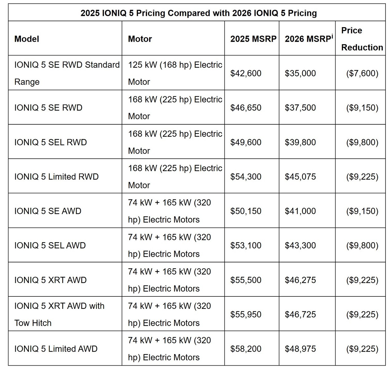 Den största prissänkningen 2026 Ioniq 5 gick för SEL AWD-trim med 318 mil räckvidd och 320 hk, som nu har sjunkit från $ 53,100 43,300 till $ XNUMX XNUMX. Dessutom finns det en $ 11,000 2025 Retail Bonus Cash-kampanj tillgänglig på utvalda Ioniq 5-fordon som finns tillgängliga i återförsäljarens lager om de levereras mellan 1 oktober och 3 november 2025.