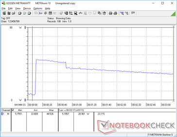 När CPU-klockfrekvensen stressades under Prime95 steg den till 3,9 GHz bara under den första sekunden innan den nådde en kärntemperatur på 99 C. Klockfrekvensen minskade sedan stadigt och växlade så småningom mellan 1,4 GHz och 1,7 GHz med en cyklande kärntemperatur på 68 C och 75 C. Detta cyklande beteende observerades också på InBook X1 Pro och förklarar de cyklande CineBench R15 xT-loop-resultaten från ovan. CPU-paketets effekt ökade till 44 W i början av Prime95-stresstestet innan den sjönk och stabiliserades på cirka 15 W.