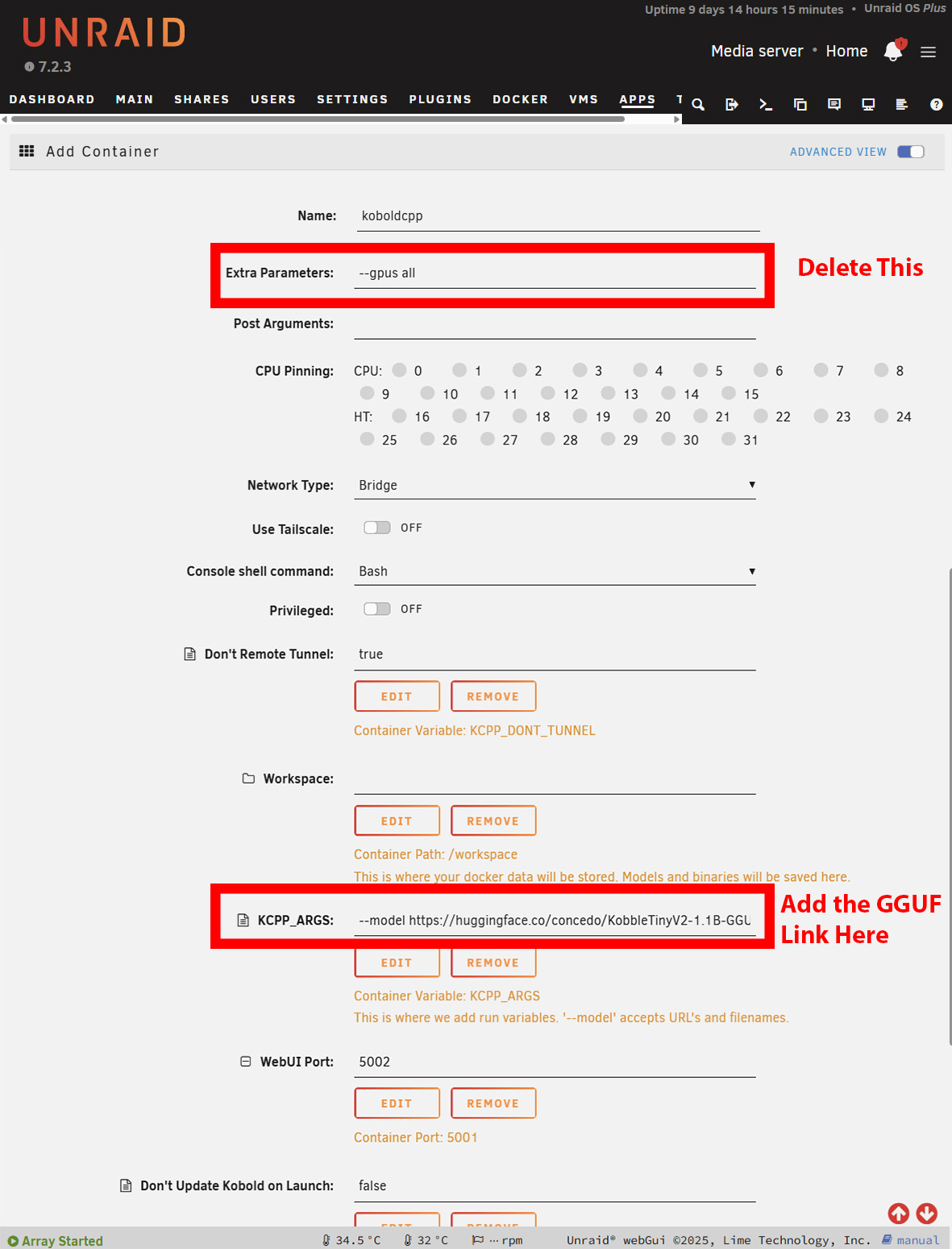 Installationen på Windows är i stort sett densamma. Du måste dock ladda ner NoCUDA version om du använder utan en GPU. Det kan ta ett tag att starta, eftersom KoboldCPP kommer att ladda ner modellen innan du presenterar gränssnittet. På Windows är detta uppenbart, men på Unraid eller TrueNAS måste du öppna loggarna för att se hur nedladdningen fortskrider. På Unraid kan du behöva öka docker-containerns tillgängliga lagring beroende på hur stor din valda modell är.