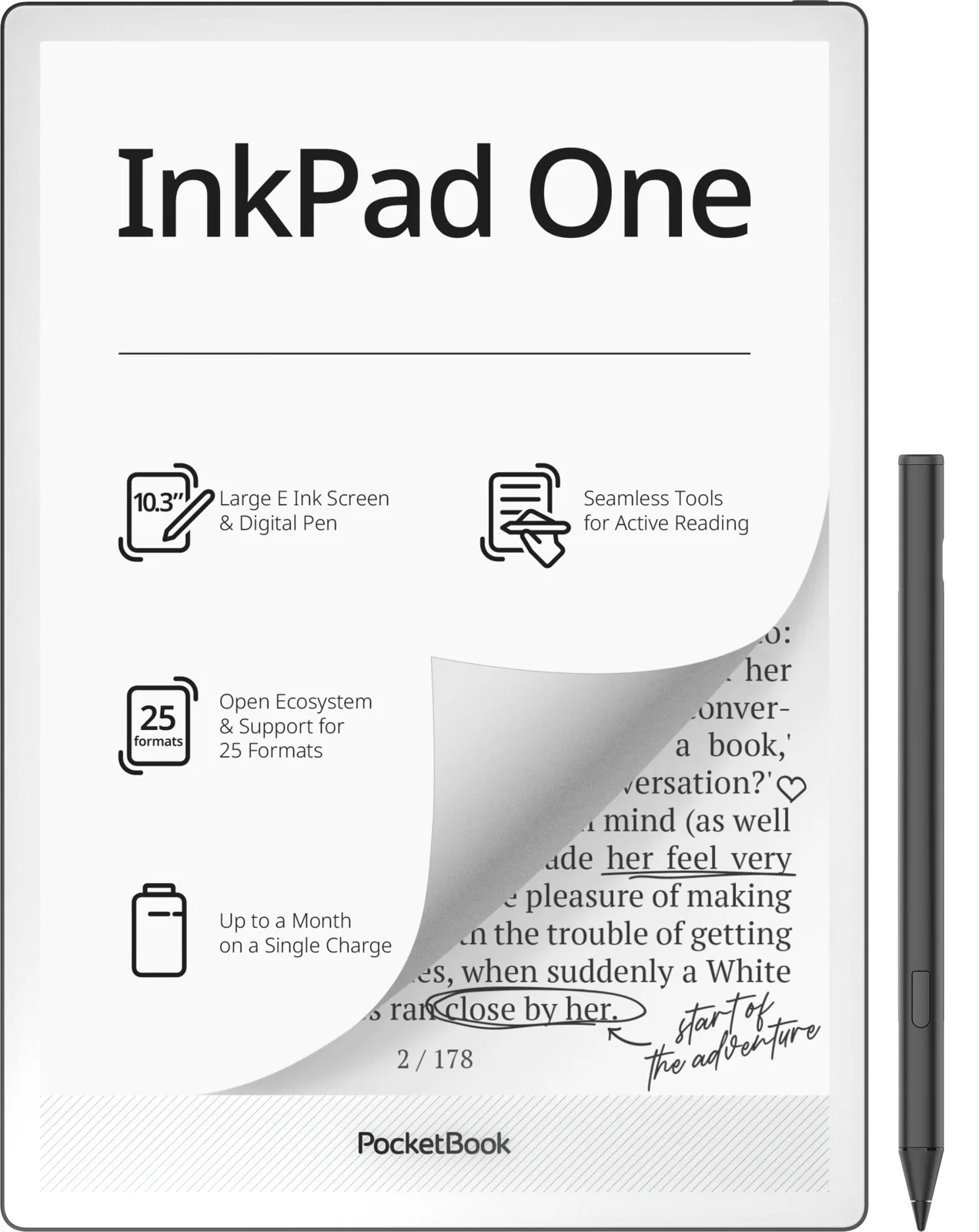 Förutom att visa innehåll kan e-läsaren också användas för att göra anteckningar. InkPad One har en anteckningsfunktion som gör att du kan lägga till kommentarer och markeringar med hjälp av den medföljande Stylus 2. Den 5,15 mm tunna enheten erbjuder även uppspelning av ljudfiler, t.ex. ljudböcker och andra filer, via Bluetooth, samt en text-till-tal-funktion för uppläsning av textfiler