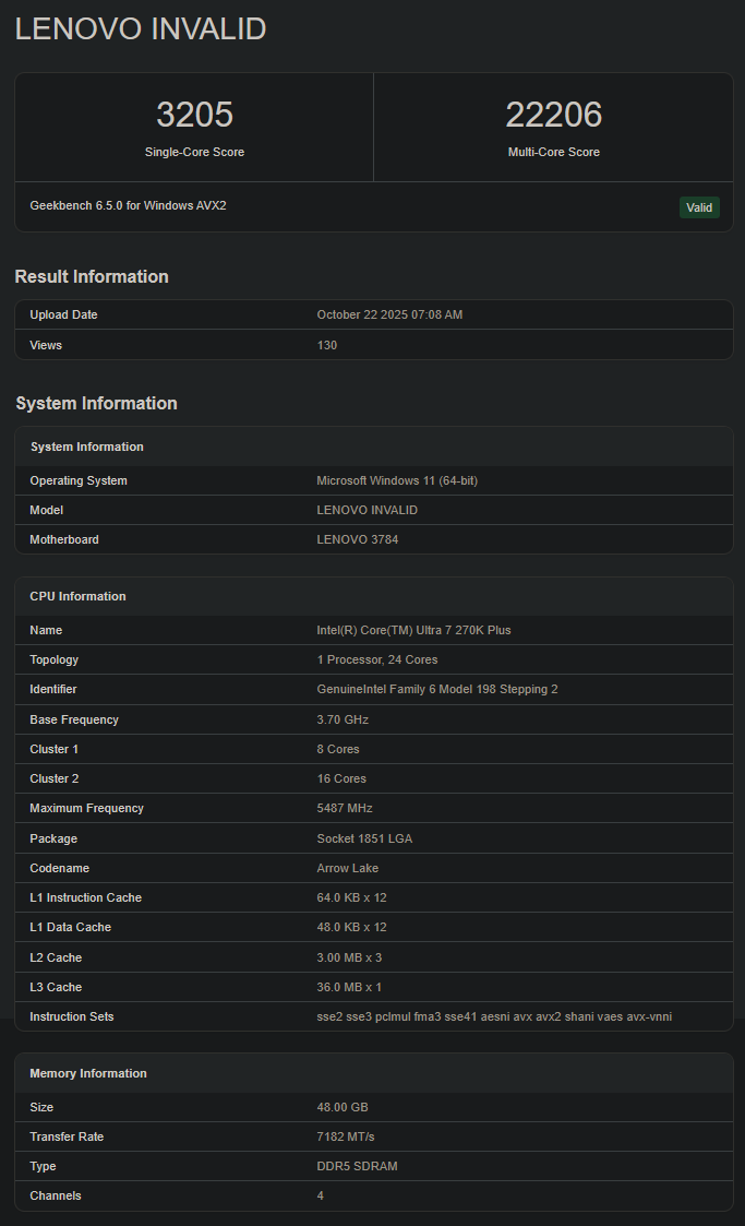 Den får 3 205 och 22 206 poäng i Geekbench 6.5:s single och multi-core tester, respektive. Core Ultra 7 270K Plus har 24 kärnor (8 P + 16 E), 24 trådar och en boostklocka på 5,4 GHz. Den driver en ospecificerad Lenovo-dator med 48 GB DDR5-7182 (DDR5-7200) RAM-minne som kör Windows 11. Geekbench's back-end avslöjar att den testades tillsammans med en GeForce RTX 5090 D, en GPU som endast finns i Kina.