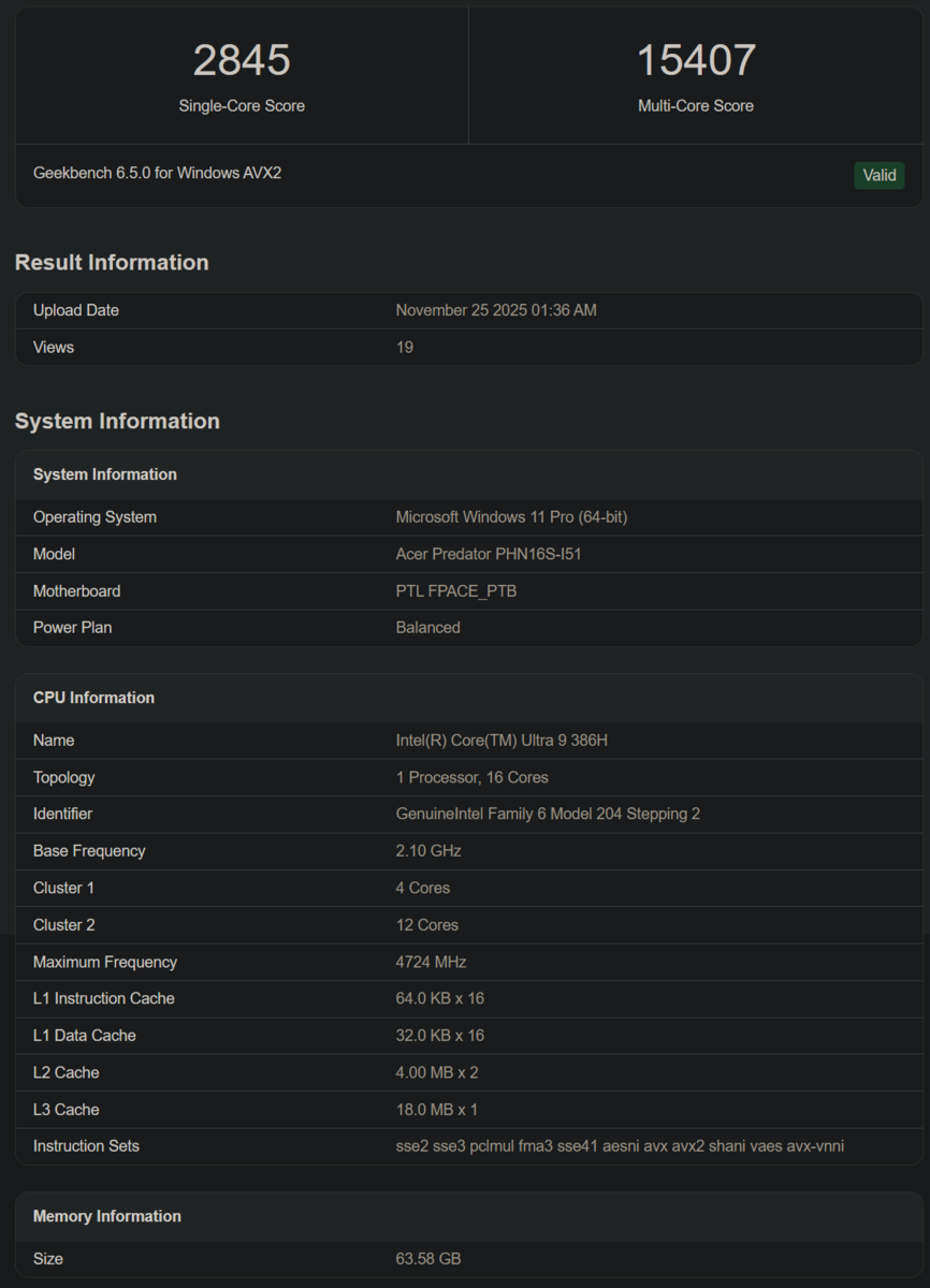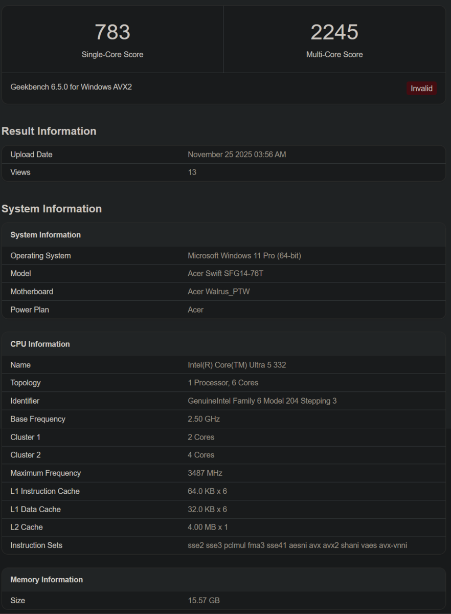 Om vi går vidare till instegsmodellen Core Ultra 5 322, så är dess Geekbench score är flaggat som ogiltigt. Men listningen belyser dess specifikationer, nämligen 2 P-kärnor, 2 E-kärnor och 2 LPE-kärnor. Just den här bärbara datorn tillhör Acer Swift-serien och har 16 GB RAM, en RTX 5060 GPU och en ospecificerad Intel Graphics-adapter.