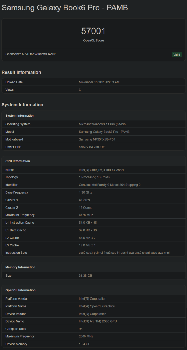 Den bärbara datorn i fråga är den kommande Samsung Galaxy Book6 Pro. En alternativ variant med en Core Ultra 5 338H läckte tidigare med en Arc B570 iGPU. Den har 32 GB RAM-minne, med 16 GB allokerat till iGPU:n i detta fall. Den förväntas lanseras nästa år tillsammans med den mer kraftfulla Galaxy Book6 Ultra.