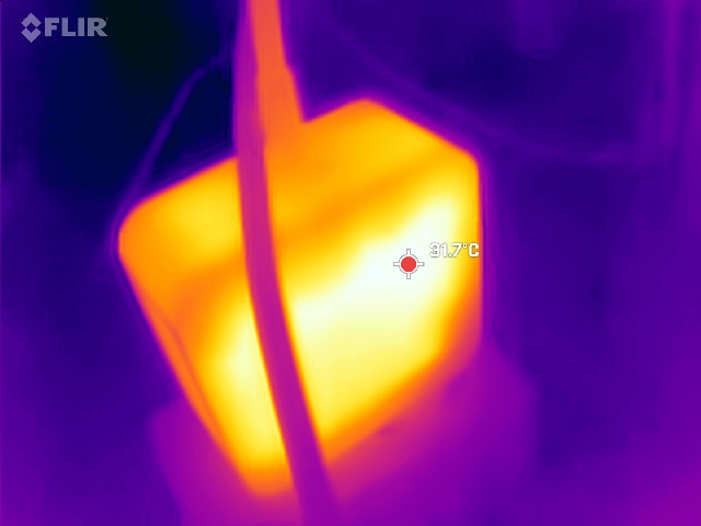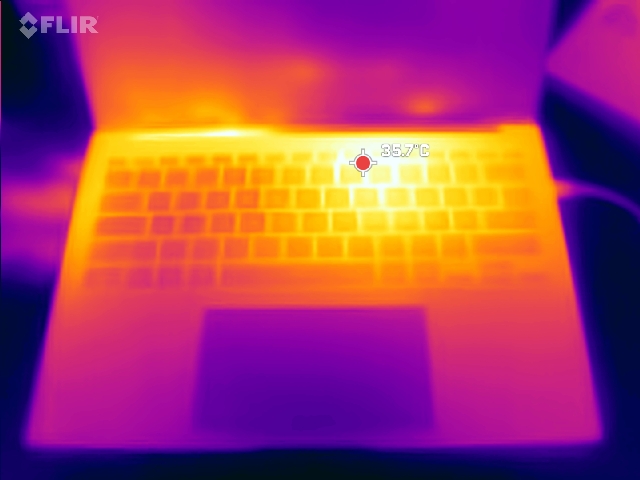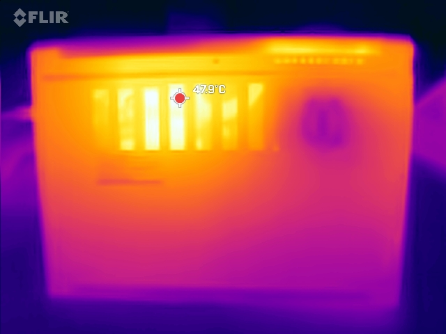 Hot spot under full belastning når 47 °C, vilket är ungefär samma som AMD-versionen (på undersidan nära skärmen). Intel-systemet förblir dock lite svalare på sidan bort från den enda fläkten. Det vänstra tangentbordsområdet och handledsstöden i synnerhet förblir behagligt svala.
