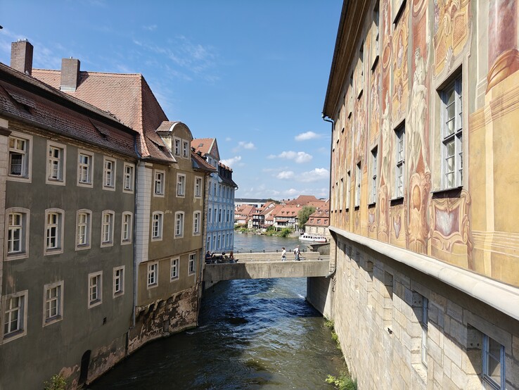 Snart står vi på en bro över floden Regnitz och tittar på det medeltida gamla rådhuset som har legat mitt i floden sedan 1467. Den färgglatt målade byggnaden fungerar som ett utmärkt fotomotiv, vilket får oss att noggrant undersöka prestandan hos de två smartphonekamerorna i mellanklassen.