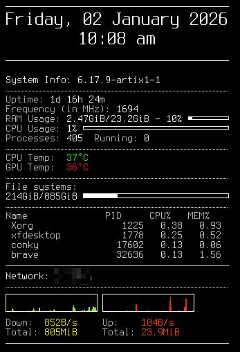 Anpassning är en fråga om att ge och ta och kommer att variera beroende på vilken skrivbordsmiljö eller fönsterhanterare du väljer. Jag använder XFCE4, som kan anpassas ganska mycket men som kräver viss teknisk kunskap för att försköna. Det stöder ett verktyg som heter Conky, som kan visa systeminformation på skrivbordet. Det är mycket anpassningsbart men använder ett typescript-format i en konfigurationsfil för att göra det.