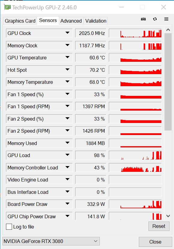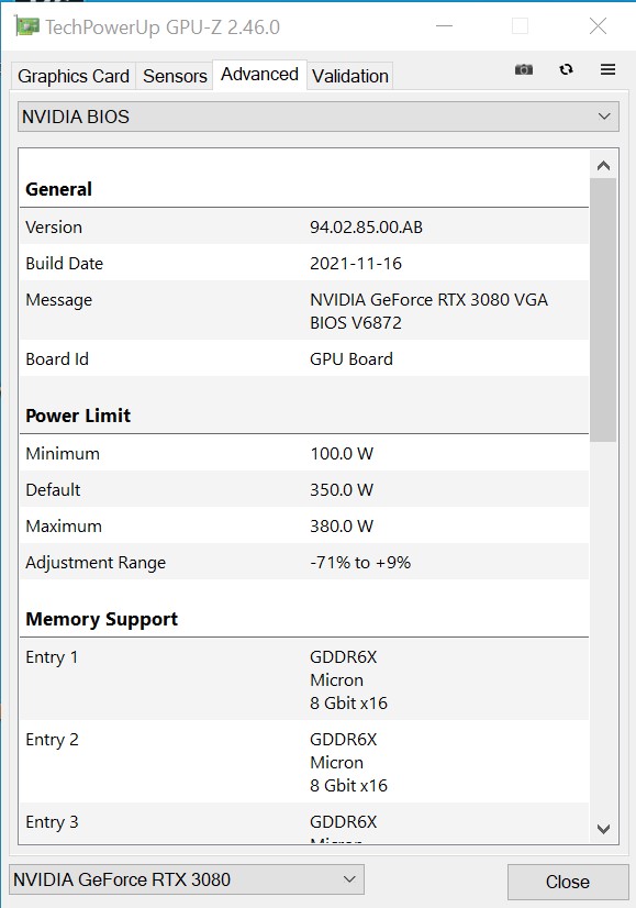 KFA2 GeForce RTX 3080 SG 12 GB:s test-enhetens boost-klockhastigheter låg bara något över Nvidias specifikationer. Vi bör dock tillägga att de specificerade 1 740 MHz boostklockorna konsekvent överträffades i nästan varje enskilt test vi körde. Den här modellen stöder en ökning av effektmålet med upp till nio procent vilket resulterar i en total maximal effektförbrukning på 380 W.
