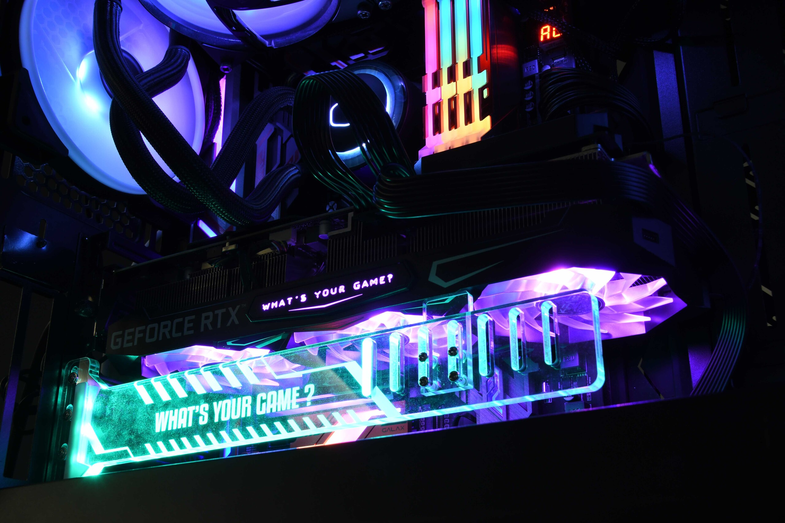 För den här recensionen fick vi ett GeForce RTX 3080 12 GB av KFA2. Just den här modellen är baserad på GA102-chippet med totalt 8 960 shaders, vilket bör förbättra prestandan och hjälpa till att stänga eller åtminstone minska gapet till Nvidia GeForce RTX 3080 Ti. Dessutom levereras KFA2 GeForce RTX 3080 SG 12 GB med en ganska voluminös kylare som är utformad för att avleda kortets 350 W värme på ett tillförlitligt och snabbt sätt. Tänk på att dess design med tre slitsar tar upp mycket utrymme och kanske inte passar i ditt hölje. De tjusiga RGB-ljusen hjälper till att belysa och framhäva dess tre 92 mm fläktar och den slogan "What's Your Game" som är tryckt på kortet.