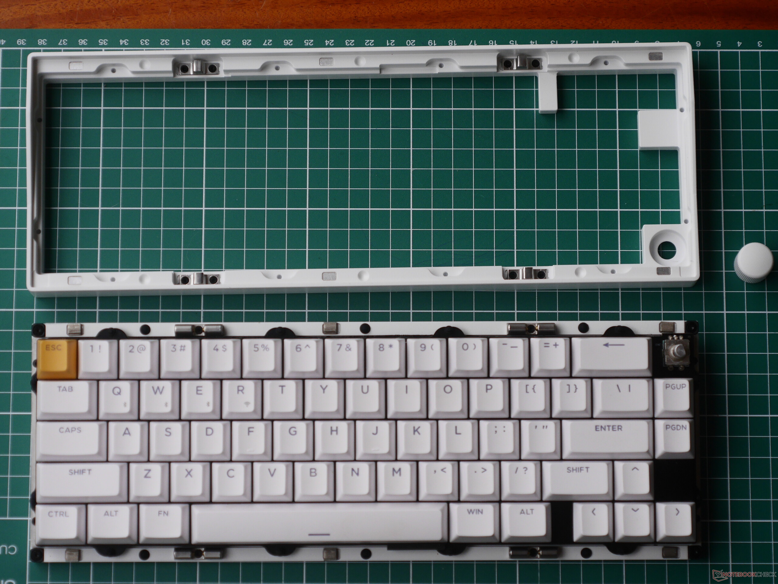 Lemokey P2 HE är imponerande välbyggt, särskilt med tanke på hur mycket billigare det är än många andra Keychron- och Lemokey-tangentbord. Ytfinishen på e-beläggningen är jämn och det CNC-frästa aluminiumhöljet är snyggt, både på insidan och utsidan. Den roterande kodaren känns också bra att använda: spärrarna under hela rotationen och det positiva klicket när den trycks in ger båda tillfredsställande feedback, och den kan packa många funktioner på samma utrymme som en tangent.
