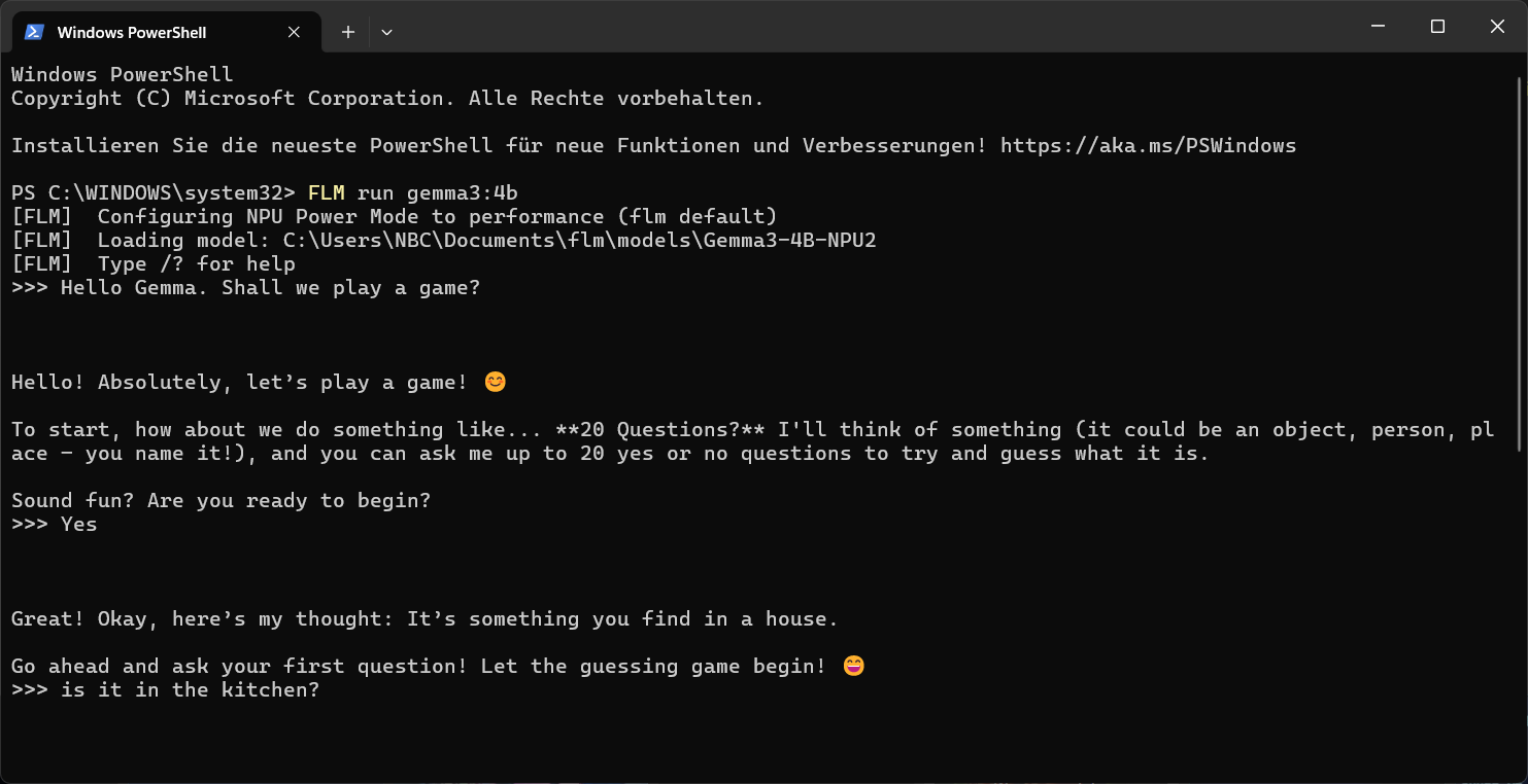 De som använder LM Studio på resor får tyvärr vara beredda på att batteriet tar slut snabbt. LM Studio använder både CPU och GPU för alla beräkningar. Den energieffektiva NPU:n i vår Ryzen 7 350 lämnades tyvärr orörd. FastFlowLM låter dig dra nytta av NPU-prestandan i AMD-chippet. Detta medför en betydligt lägre strömförbrukning, trots att LLM:erna inte körs märkbart långsammare på NPU:n. Kvaliteten på utdata förblir oförändrad. FastFlowLM är dock något svårare att använda än LM Studio, eftersom det inte har ett eget grafiskt användargränssnitt. Ett GUI för FastFlowLM kan erhållas via Open WebUI. Annars används det via Windows PowerShell. Även om det kan vara en unik upplevelse.