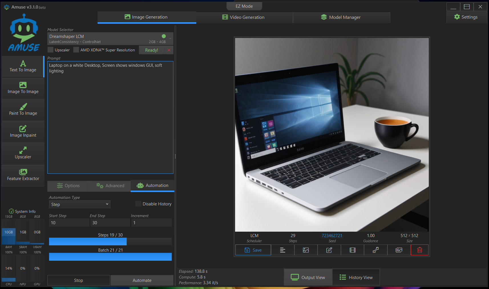 Vi körde Amuse i dess senaste version vid testtillfället (3.1). Programvaran är gratis och installeras bekvämt. AMD-processorns NPU stöds här, vilket bör märkbart påskynda arbetet med AI, även utan en dedikerad GPU. Förutom text-till-bild-generering erbjuder den också bild-till-video- och bild-till-bild-funktioner.
