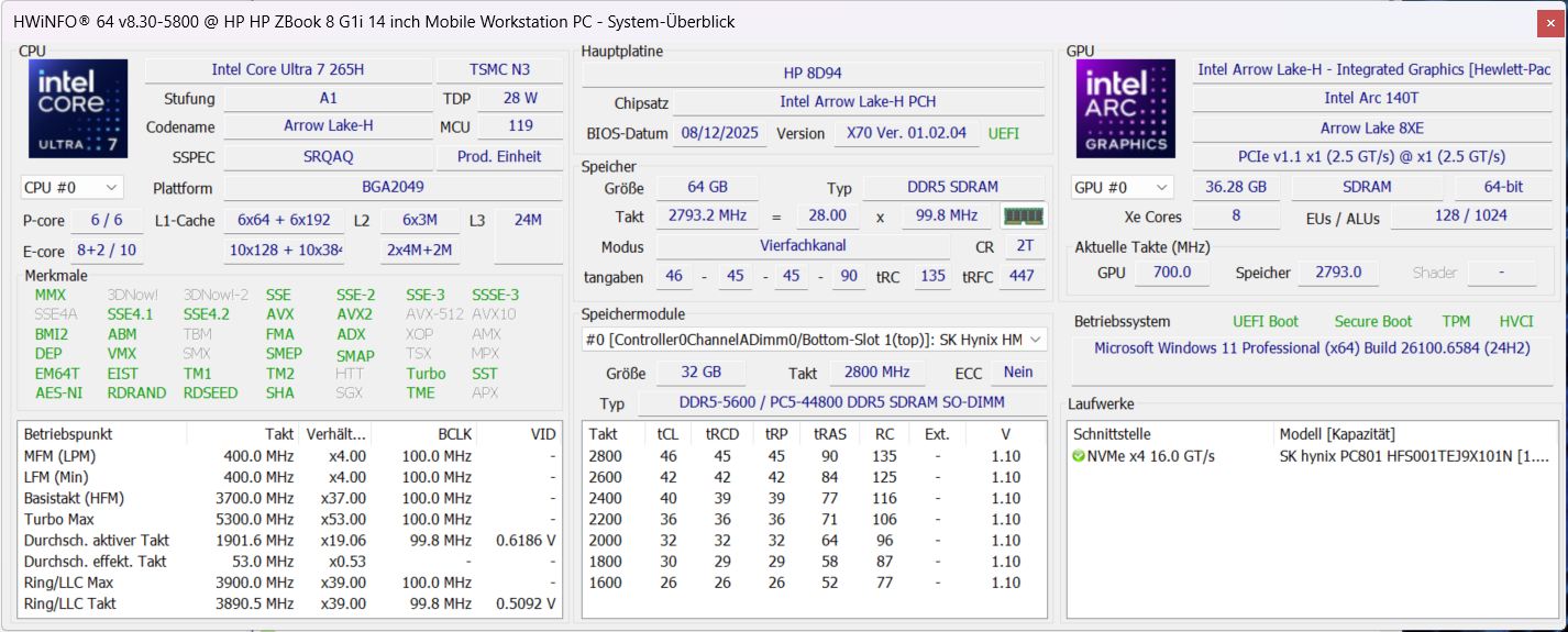 HP ZBook 8 G1i 14 Intel Core Ultra 7 255H ⎘ Intel Arc Graphics 140T ⎘ 32 GB Minne, 1024 GB SSD | Amazon: $2,968.00 Listpris: 1860 Euro | 1.7 kg | 23 mm | 14.00" 2560x1600 216 PPI IPS LED | |