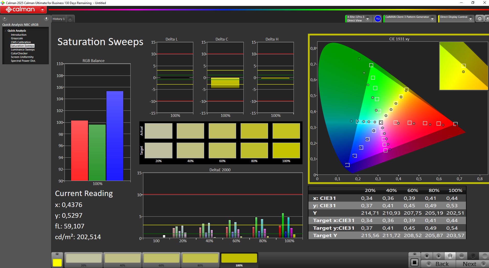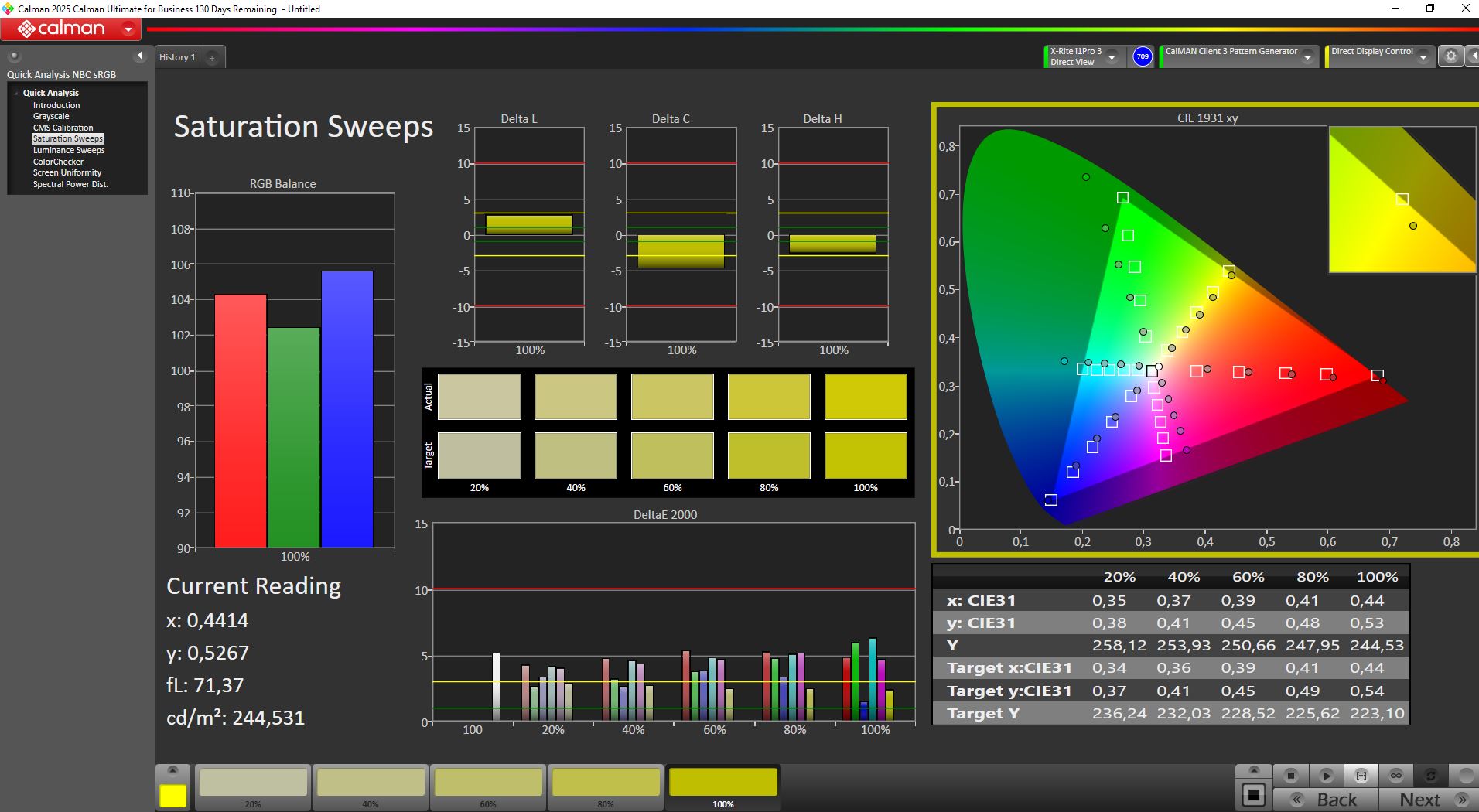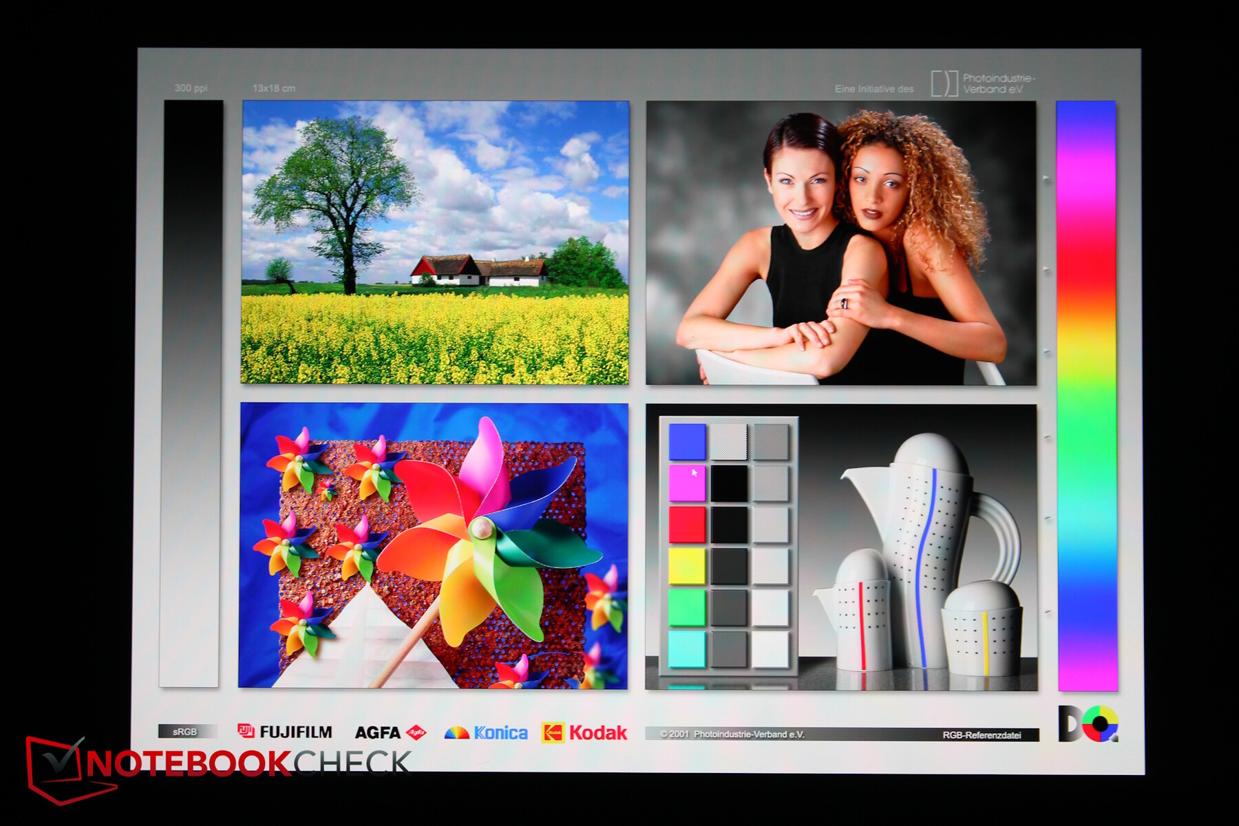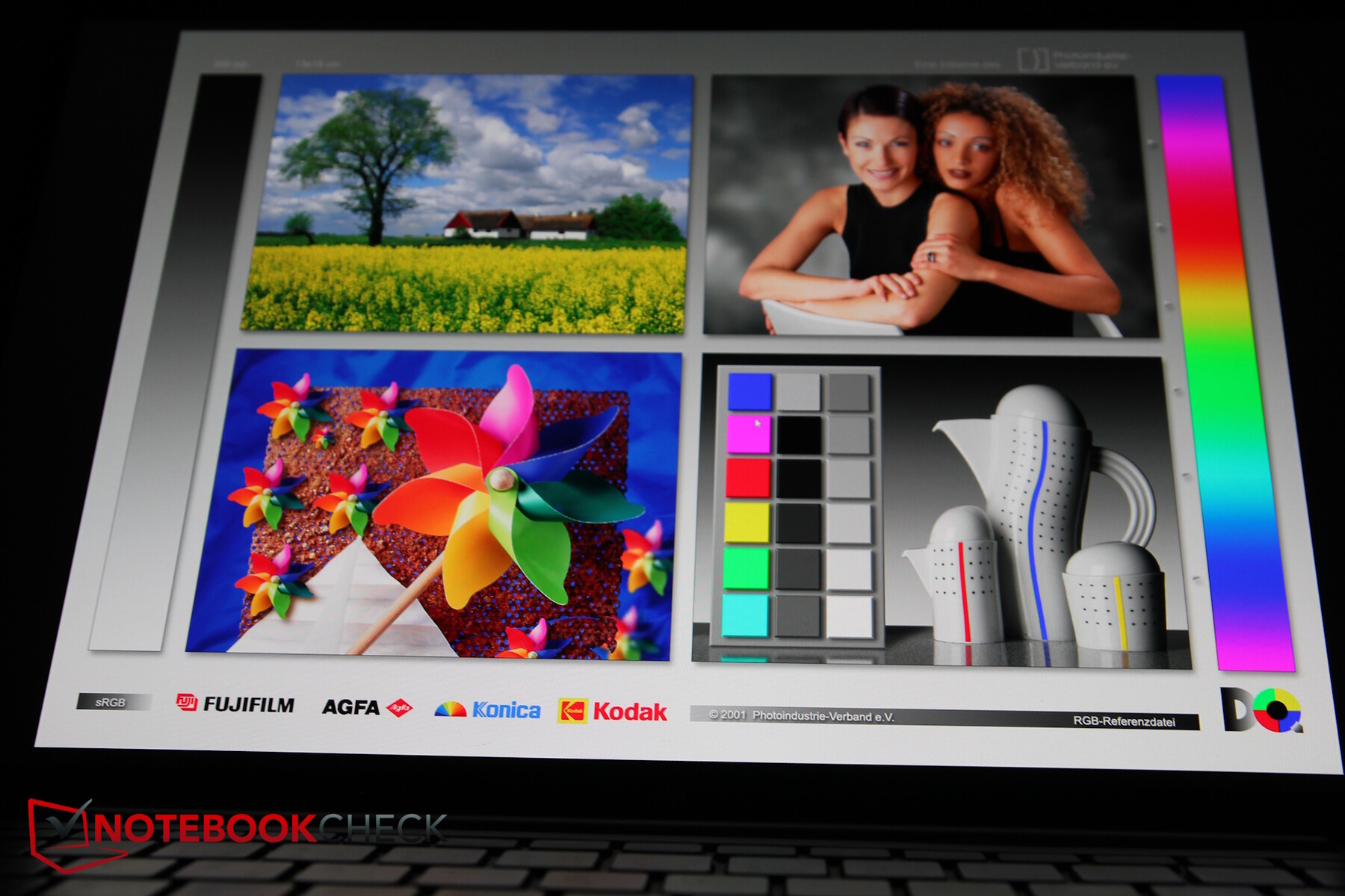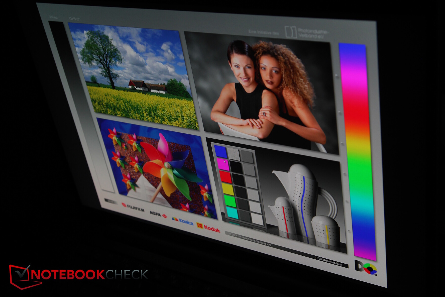 Vår enhet nådde "bara" 429 nits, men svartnivån och kontrasten är imponerande, och panelen täcker nästan helt färgrymderna sRGB, DisplayP3 och AdobeRGB.