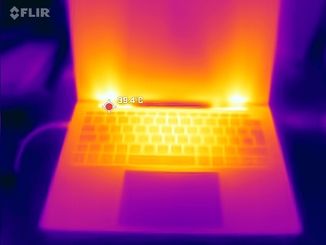 I stresstestet når den hetaste punkten 43 °C på undersidan, nära mitten mot skärmen. Det centrala området på tangentbordet värms också upp, men båda sidorna förblir svalare och handledsstöden förblir behagligt svala.