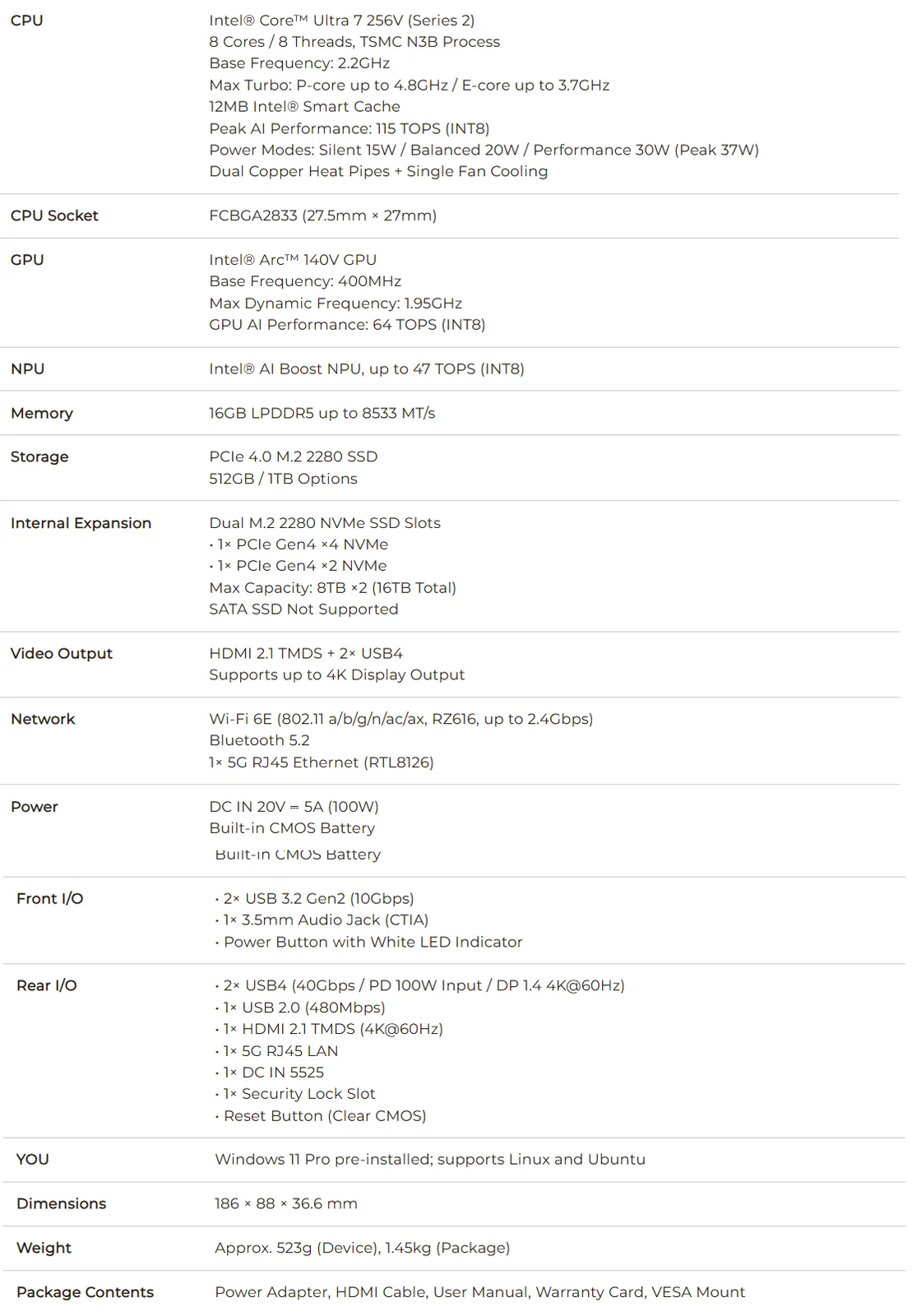 Under huven har denna lilla mini-dator en Intel Core Ultra 7 256V, en processor i övre mellanklassen från Lunar Lake-serien. Den har följande funktioner arc 140V iGPU, som smidigt kan hantera ett stort antal moderna spel i 1080p-upplösning med tweaks på de visuella inställningarna.