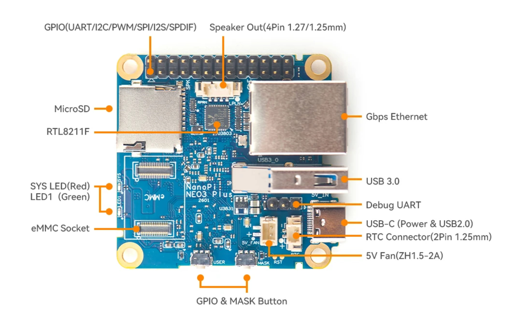 Dessutom har FriendlyElec inkluderat kontakter för anslutning av stereohögtalare, liksom en 5V fläkthuvuden, debug UART och en eMMC-sockel. Det 48 x 48 mm och 21,5 g tunga kortet innehåller också röda och gröna lysdioder samt en 2-pins RTC-kontakt. Enligt företagets wikistöder Neo3 Plus flera Linus 6.1 LTS-forks, inklusive Debian 13 Core och Ubuntu Core 24.04.