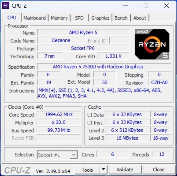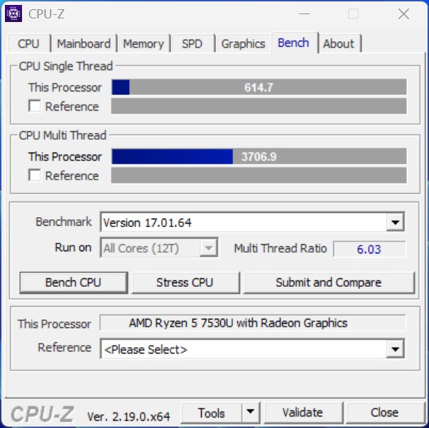 AMD Ryzen 5 AMD Ryzen 5 7530U erbjuder solid CPU-prestanda i mellanklasssegmentet. Med sex kärnor och tolv trådar är den särskilt lämplig för multitasking, kontorsapplikationer och produktiva arbetsbelastningar. Processorn klarar också mer beräkningsintensiva uppgifter som databehandling eller ljusrendering på ett tillförlitligt sätt, men ligger fortfarande under nuvarande avancerade modeller.