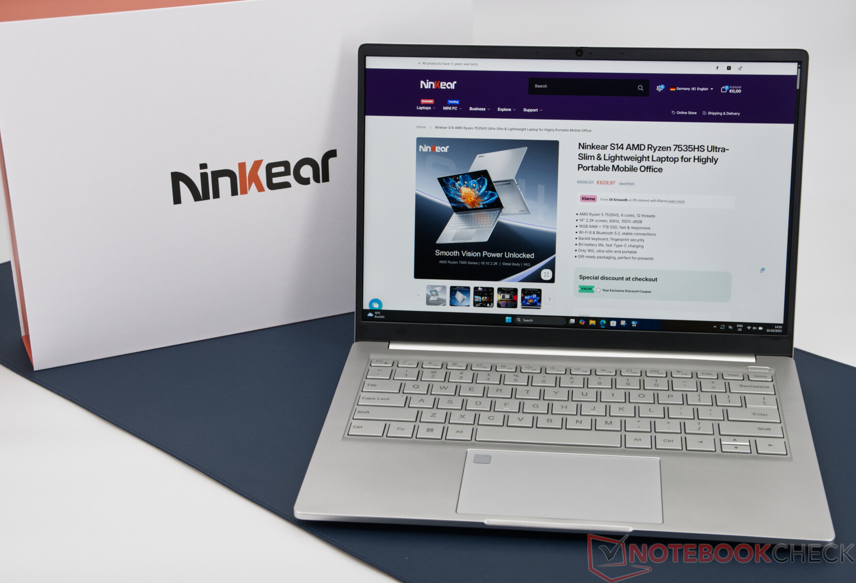 Skärmen är en av de mest positiva egenskaperna: den inbyggda IPS-panelen imponerar med en skarp 2K-upplösning, nästan fullständig sRGB-färgrymdstäckning och stabila betraktningsvinklar. Med en ljusstyrka på cirka 360 cd/m² är den tillräckligt ljusstark för inomhusbruk. Begränsningar uppstår från den glansiga ytan, som kan orsaka irriterande reflektioner i ljusa miljöer. Höljet består av en kombination av metall- och plastelement och har därför ett utseende av högre kvalitet än rena plastmodeller, men uppnår inte riktigt stabiliteten och känslan hos premiumenheter. Ninkear S14 är övervägande tyst i vardagligt bruk; fläkten blir bara tydligt hörbar under full belastning.