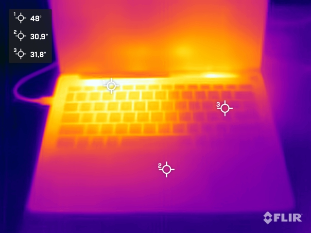 Vid daglig användning förblir GeekBook X14 Pro diskret när det gäller temperatur och värms bara upp något i typiska applikationer som kontor, webb eller streaming. Det är bara under mer krävande uppgifter som värmeutvecklingen ökar märkbart, men utan att bli kritisk eller värma upp handflatan på ett obehagligt sätt. Det kompakta kylsystemet är anpassat till det slimmade höljet och säkerställer att processorn och de interna komponenterna arbetar tillförlitligt inom det avsedda temperaturintervallet även under belastning.