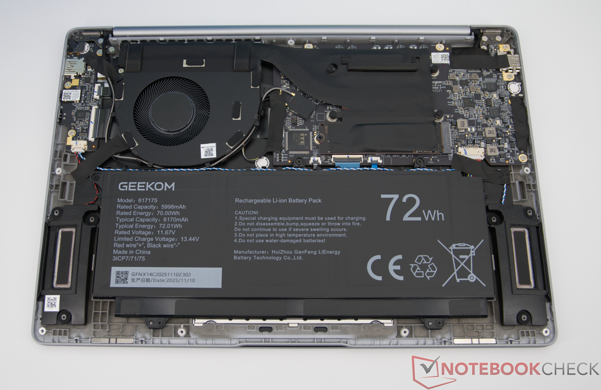 GeekBook X14 Pro förlitar sig på ett batteri med en kapacitet på 72 Wh, vilket möjliggör en anständig drifttid i blandad daglig användning av kontor, webb och streaming och möjliggör mobilt arbete i flera timmar. Beroende på användning kan en stor del av en arbetsdag klaras av utan eluttag. Om batteriet är tomt tar en full laddning cirka tre timmar.