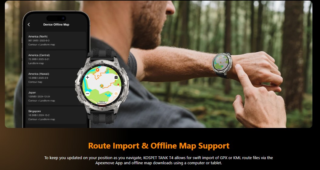 Som vanligt är optiska sensorer installerade, som inte bara används för att mäta hjärtfrekvensen utan även syremättnaden. EKG stöds inte, men sömnövervakning finns ombord. Kospet Tank M4 levereras dessutom med en högtalare och mikrofon, vilket gör att den kan användas som en Bluetooth-handsfree-enhet, och den har också en walkie-talkie-funktion med en begränsad räckvidd på 40 meter. Batteritiden anges till upp till 15 dagar vid normal användning eller upp till 22 timmar i GPS-läge. Slutligen uppges klockan vara vattentät upp till ett testtryck på 10 ATM