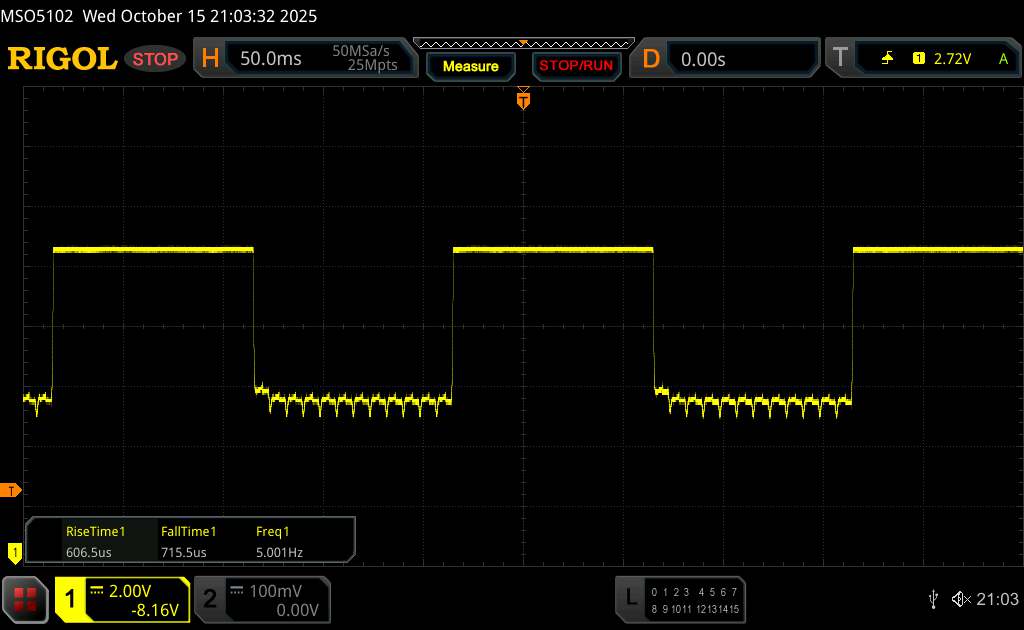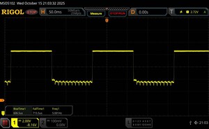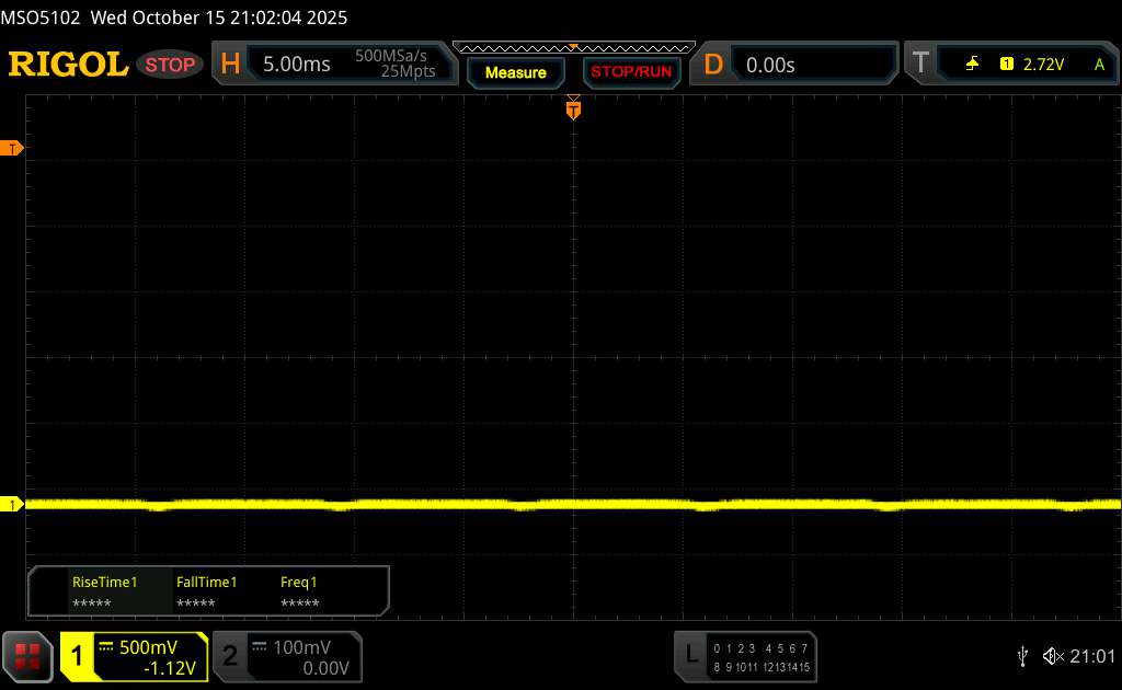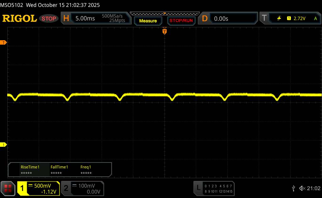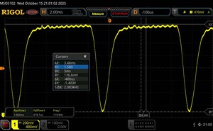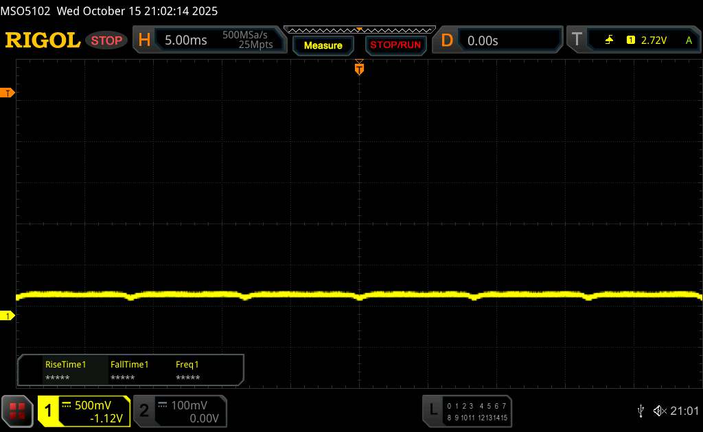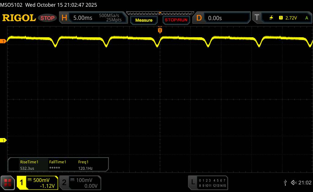 Typiskt OLED-flimmer är synligt under oscilloskopet, som visar en relativt låg basfrekvens på 120 Hz. Högfrekvent PWM-dimning och en grund amplitudkurva bidrar dock till att minska den visuella påfrestningen.