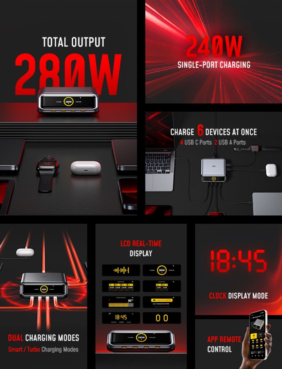 AOHi 280W GaN+ Desktop Charger är en stationär laddningsstation som kan driva en mängd olika enheter. Visuellt liknar den starkt välkända alternativ från Anker och EcoFlow. Med en uteffekt på upp till 280 W hamnar den här nya modellen mitt emellan dem. Strömförsörjningen sker via totalt sex portar, närmare bestämt fyra USB-C- och två USB-A-portar. Upp till 240 W kan levereras via en enda USB-C-port, vilket gör att även kraftfulla enheter som bärbara datorer och liknande kan laddas mycket snabbt.