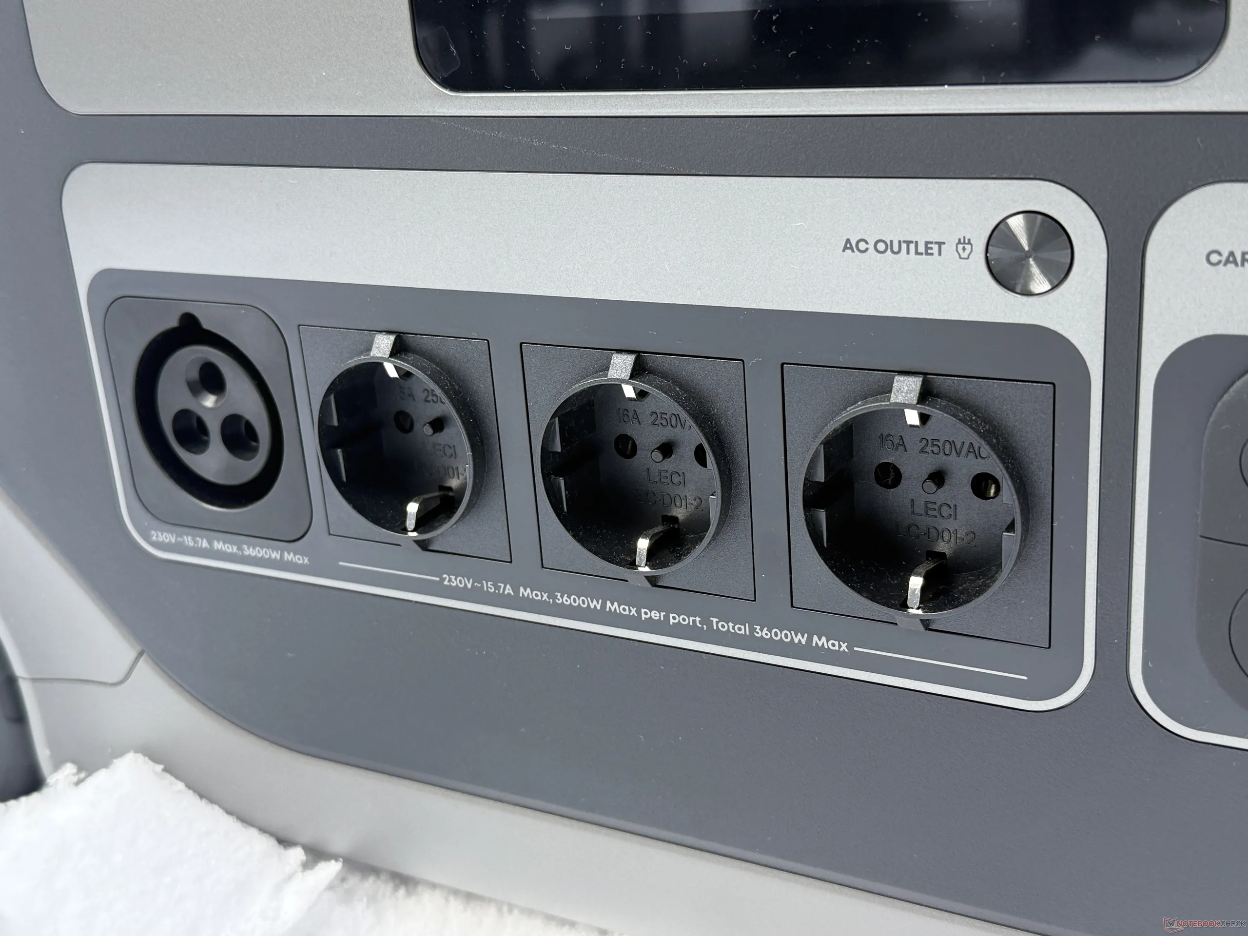 På ingångssidan erbjuder Anker Solix F3000 ännu fler alternativ än sina mindre syskon i C-serien. Istället för en IEC-kontakt har den en egen kontaktanslutning som kan leverera upp till 2 990 W till ett uttag och maximalt 3 600 W via en laddstation för elbilar.