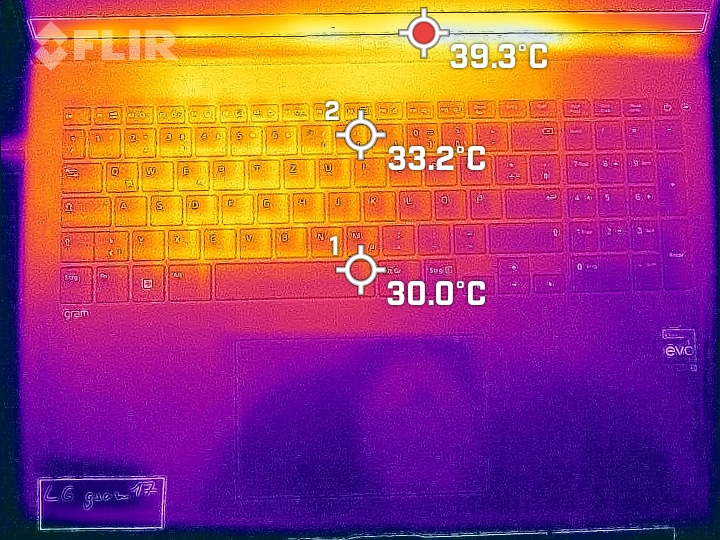 Sammantaget kan vi konstatera att den bärbara datorn har en måttlig värmeutveckling. De högsta värdena på 40 till 45,5 °C (104 - 114 °F) uppnås vid fyra mätpunkter under stresstestet. Vid daglig drift håller sig värdena inom det gröna intervallet.