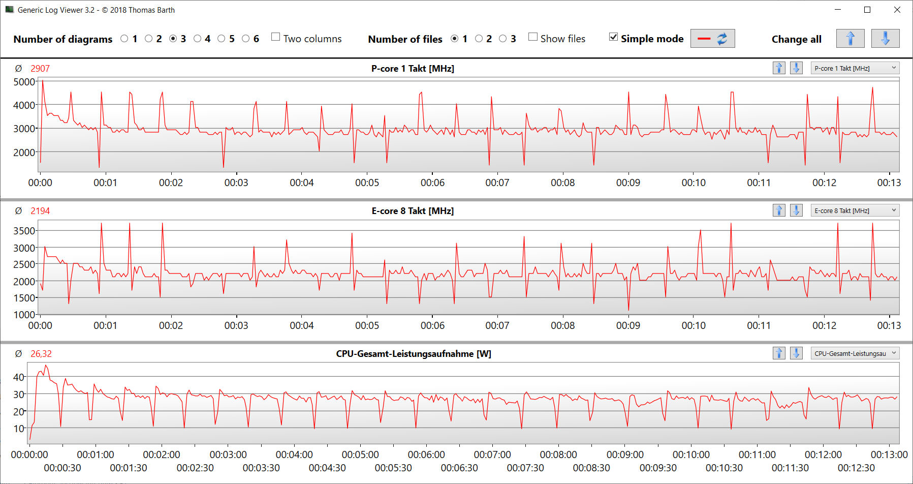 Stresstestet (med Prime95 och Furmark igång konstant) är ett extremt scenario som vi använder för att utvärdera systemets stabilitet vid full belastning. I början av testet kör CPU:n på ungefär den grundläggande klockfrekvensnivån (P: 2,1-2,4 GHz; E: 1,6 GHz) och grafikkärnan körs på 1 100-1 200 MHz. Under testets fortsättning sjunker värdena.